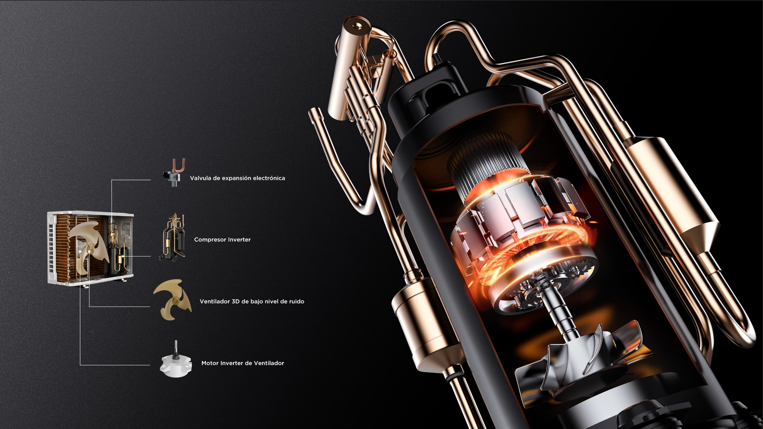 Compresor Inverter y Motor de ventilador Inverter, para garantizar un mayor ahorro de energía y confiabilidad del sistema de aire acondicionado.