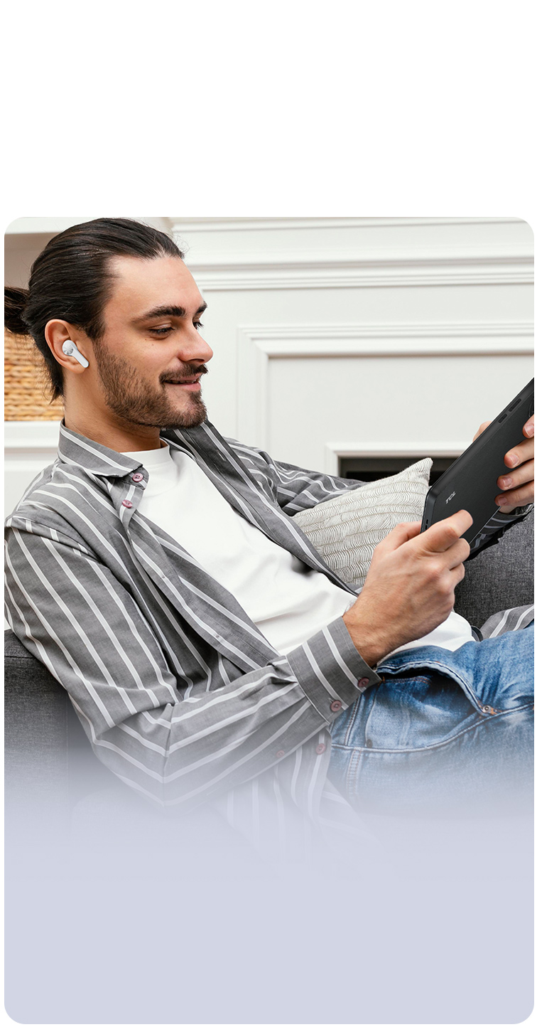 Emparejá los auriculares al instante con hasta dos dispositivos a la vez. Ahora podés escuchar música en tu tablet mientras atendés una llamada en tu teléfono, con cambio automático entre los dispositivos emparejados.