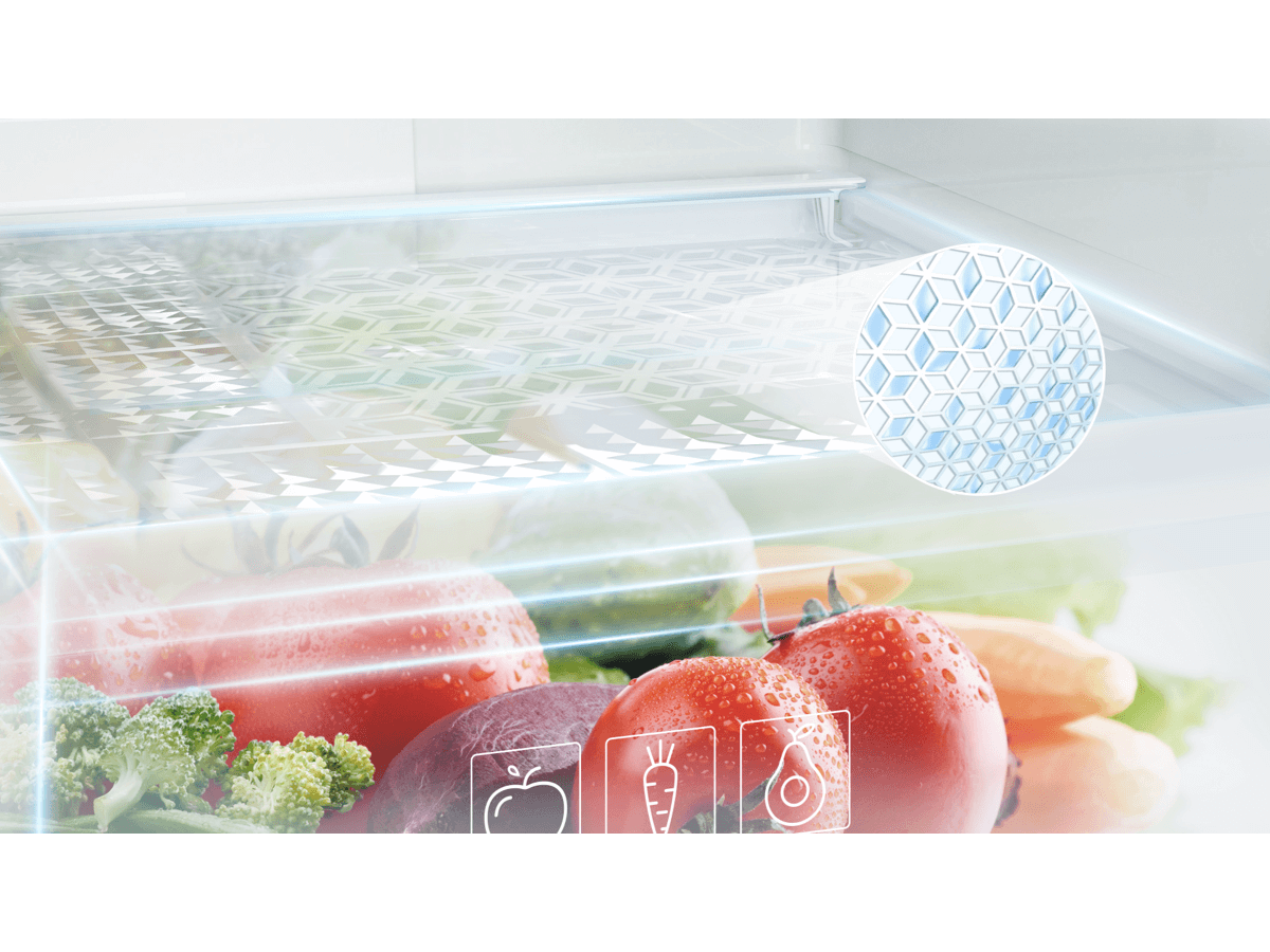 The technical humidity-balancing film securely retains moisture while automatically maintaining optimum moisture levels for vegetables and fruit.