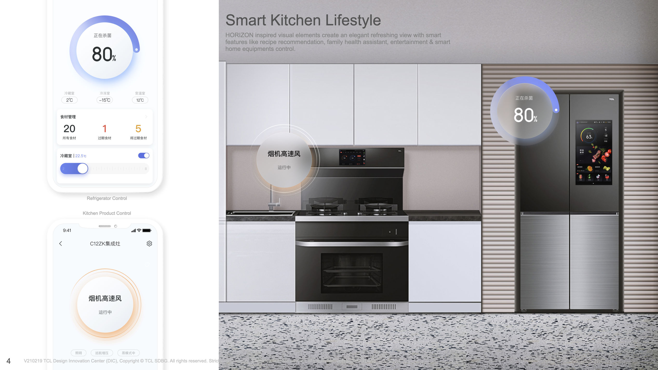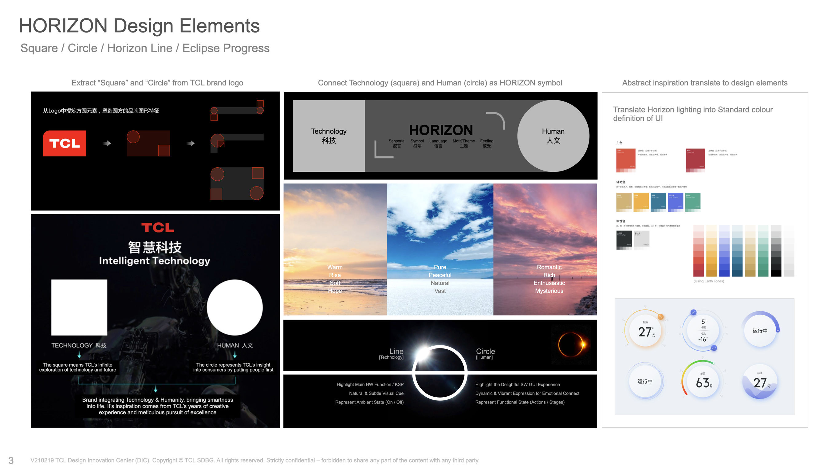 Users are overwhelmed by multiple user interface design styles in their day-to-day use of smart home products. TCL HORIZON UI creates a consistent visual and functional experience for users to intuitively operate and manage their smart home products seamlessly. The UI toolkit elements are inspired by the TCL brand logo, which consists of a square (infinite exploration of technology and future), and a circle (insights into consumers by putting people first). These elements have been combined with a horizontal line and progressive eclipse icons as the unifying design elements. The color palette relies on sunrise and sunset colors to emotionally connect with users.