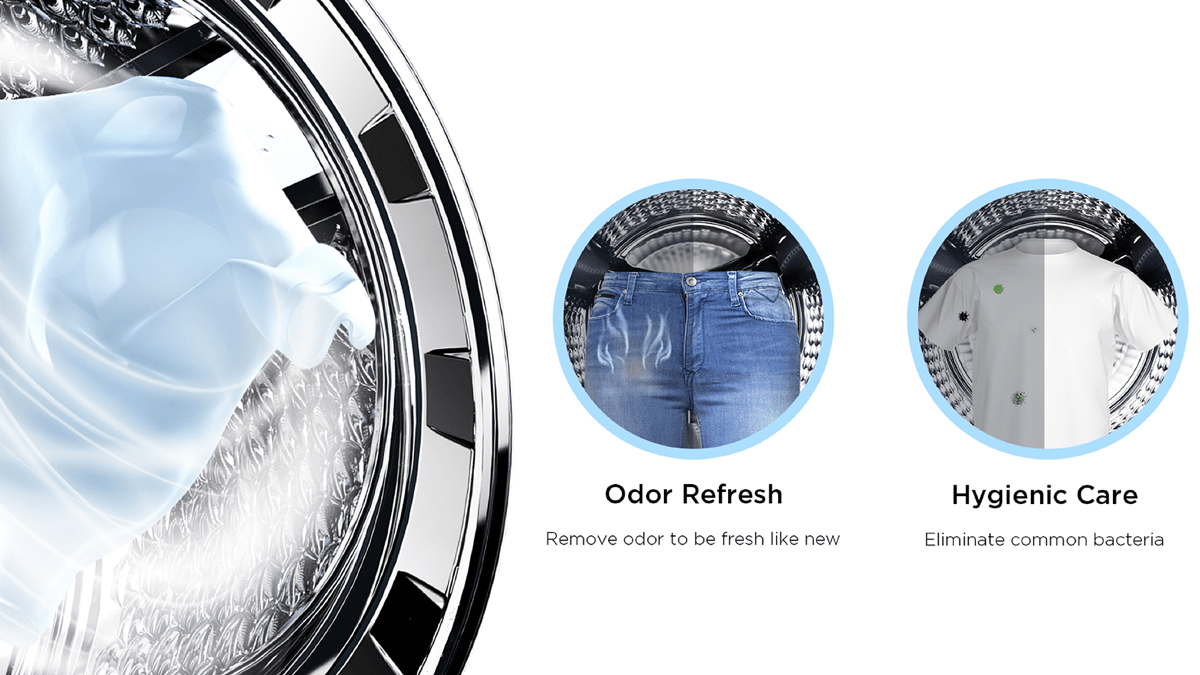 В нижней части барабана образуется гигиенический пар, благодаря чему все белье находится в паровой среде. Это уничтожает вызывающие аллергию бактерии, такие как пылевые клещи, пыльца, шерсть животных и т. д. Ваша одежда очищается тщательно и гигиенично.