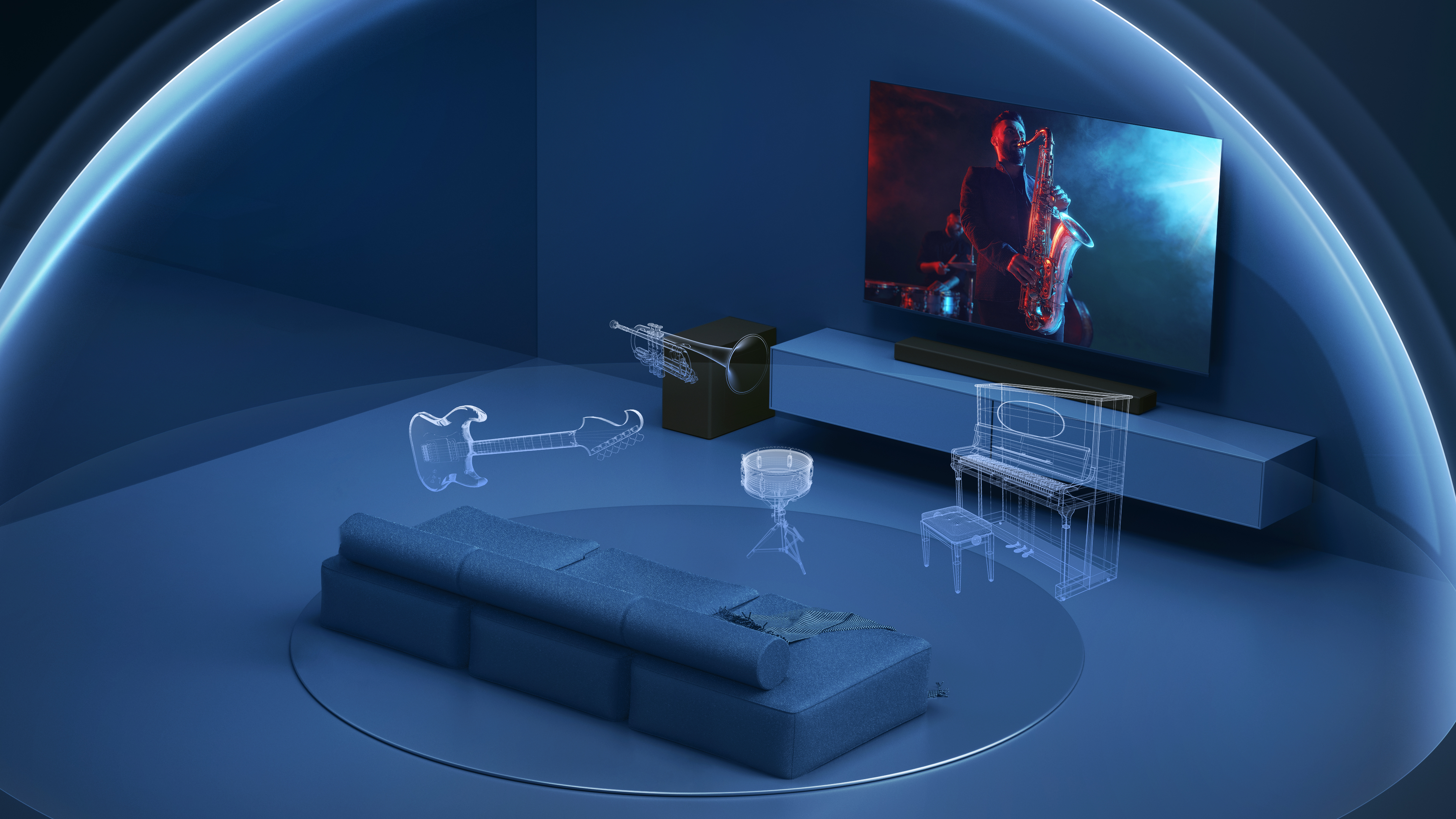 5.1.2-Kanal mit 5 Hauptklangkanälen, 1 Subwoofer und 2 Upfiring-Kanälen, damit Sie von Hause aus beim Fernsehen und Spielen einen satten 3D-Surround-Sound erleben können.