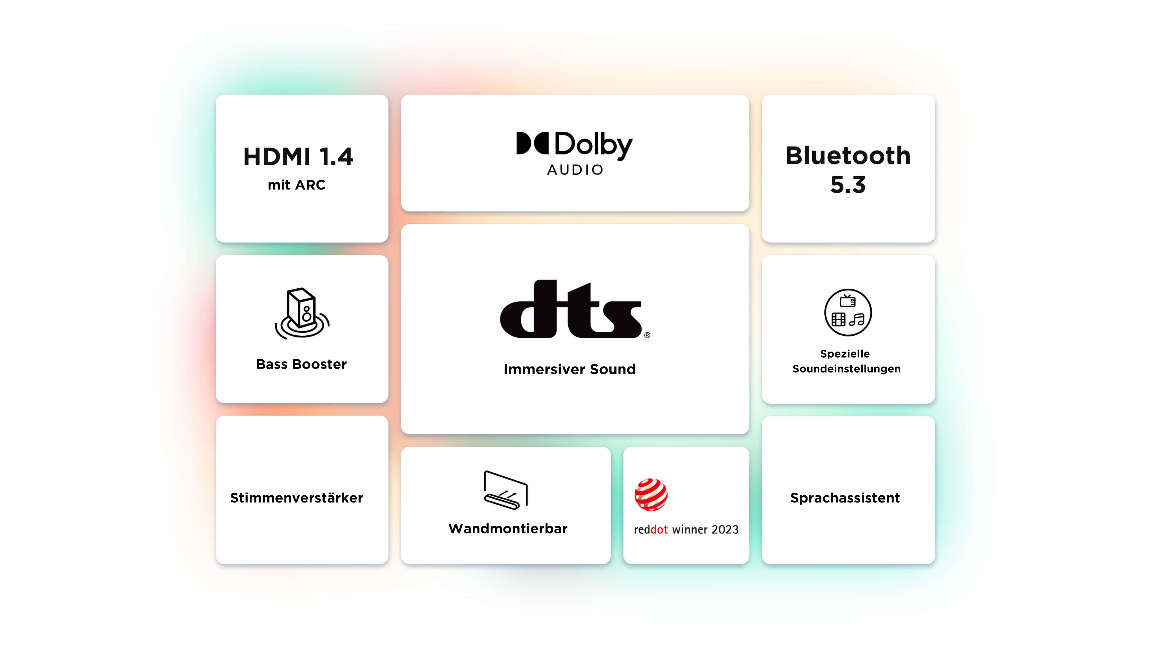 2.1-Surround Sound Kanäle mit einem kabellosen Subwoofer erzeugen einen immersiven und bebenden Sound. Optimale Stereoklänge und Tiefe sorgen für eine unverwechselbare Klangqualität.