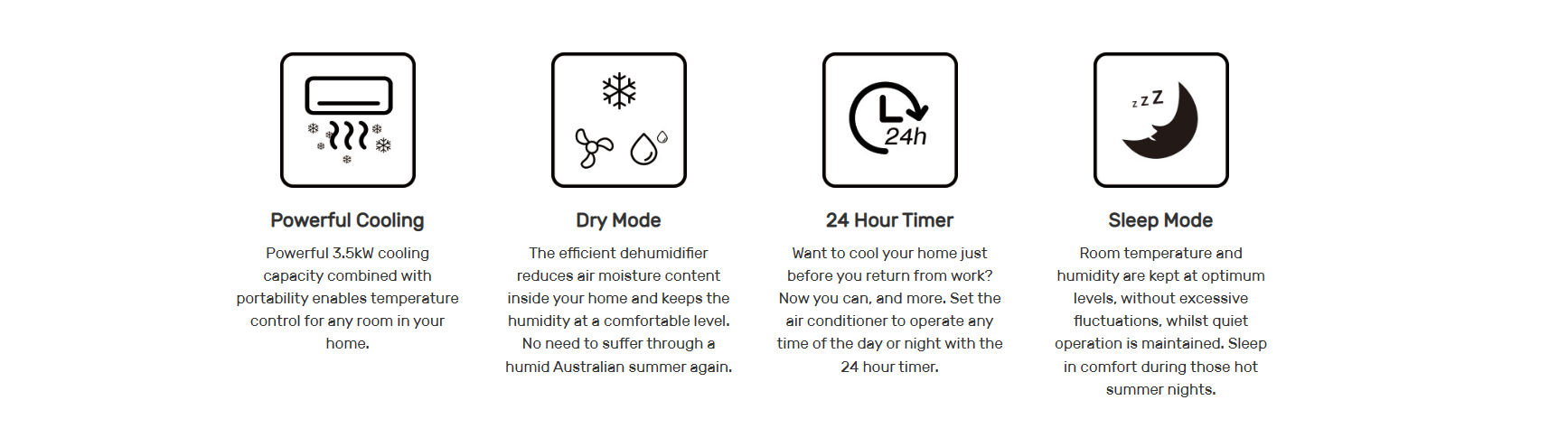 A portable air conditioner that’s easy to set up, the TAC-12CPB/MZ will keep you cool in any room, with ease. Featuring an impressive 3.5kW of cooling power, and convenient features like a 24hr timer, dry mode and sleep mode, his portable air conditioning unit will have you living, and sleeping comfortably on even the hottest summer night.