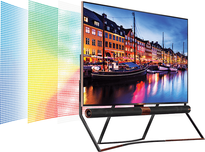 QLED TV uses the technology of quantum dots which produce pure colour by transferring LED light through quantum dot colour filters.