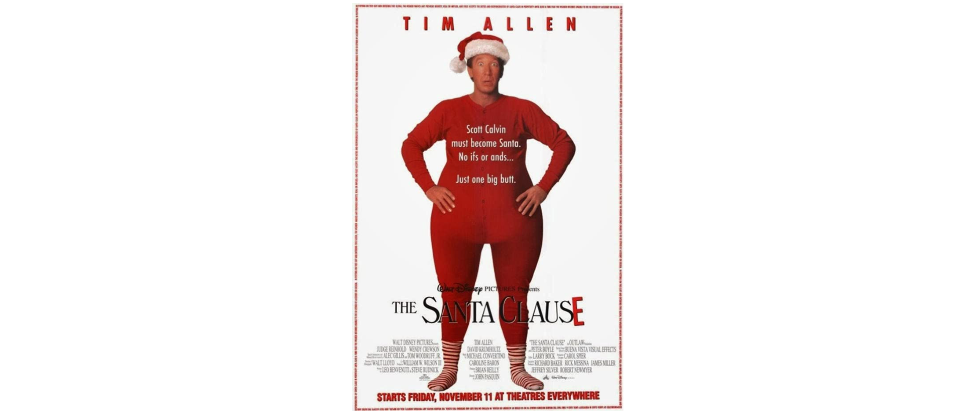 A funny Christmas movie starring Tim Allen as divorcé Scott Calvin who has an encounter with Santa and is magically recruited to take his place. Hopping into the 8-reindeer sleigh, Scott and his son Charlie carry out Santa's duties delivering gifts around town, before being transported to the North Pole. There Scott is informed by a group of elves that he is now Santa thanks to the "Santa Clause" law. Scott refuses to believe it until his beard starts growing, he puts on weight and his hair turns white. Now he has to convince all the non-believers he knows that Santa is real. The movie is rated PG and is very entertaining thanks to Tim Allen's antics.