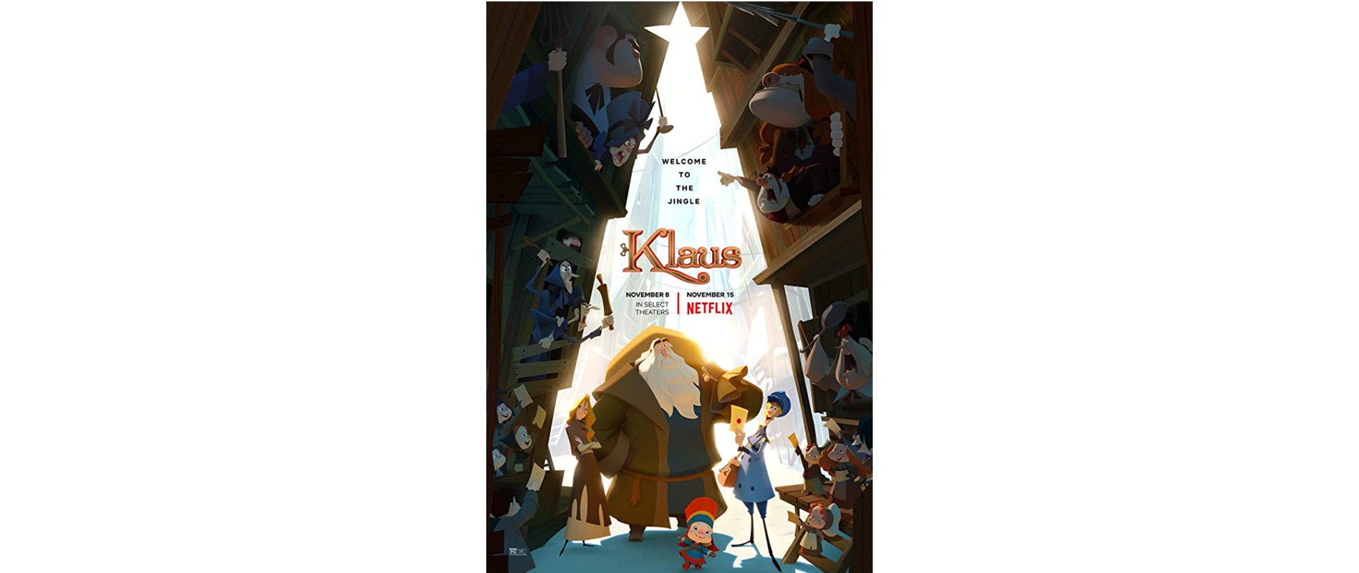 An animated Christmas comedy, Klaus is the story of the origins of Santa. The action takes place on the fictional island village of Smeerensburg situated above the Arctic Circle. Here the villagers are embroiled in a generations-old feud which leads to them regarding each other as enemies. When new postman Jesper is stationed there he finds an unlikely ally in a mysterious toymaker called Klaus who lives alone in a cabin. They become friends and help the villagers to move past old grudges, and to celebrate friendship and the spirit of giving. Rated PG.