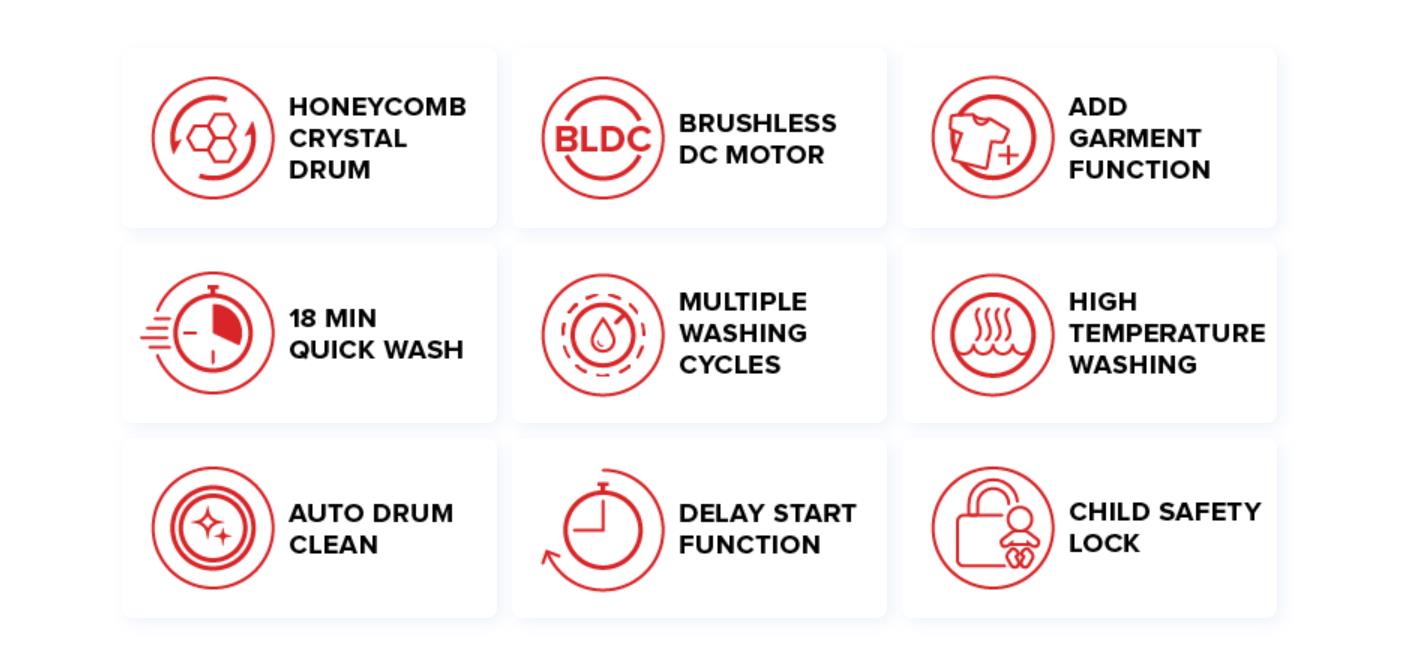 The Honeycomb Crystal Drum is gentle on your clothes whilst delivering an effective wash every time. The innovative shaped ridges create a thin film of water across the drum surface allowing clothing to glide effortlessly without snagging or pilling.
