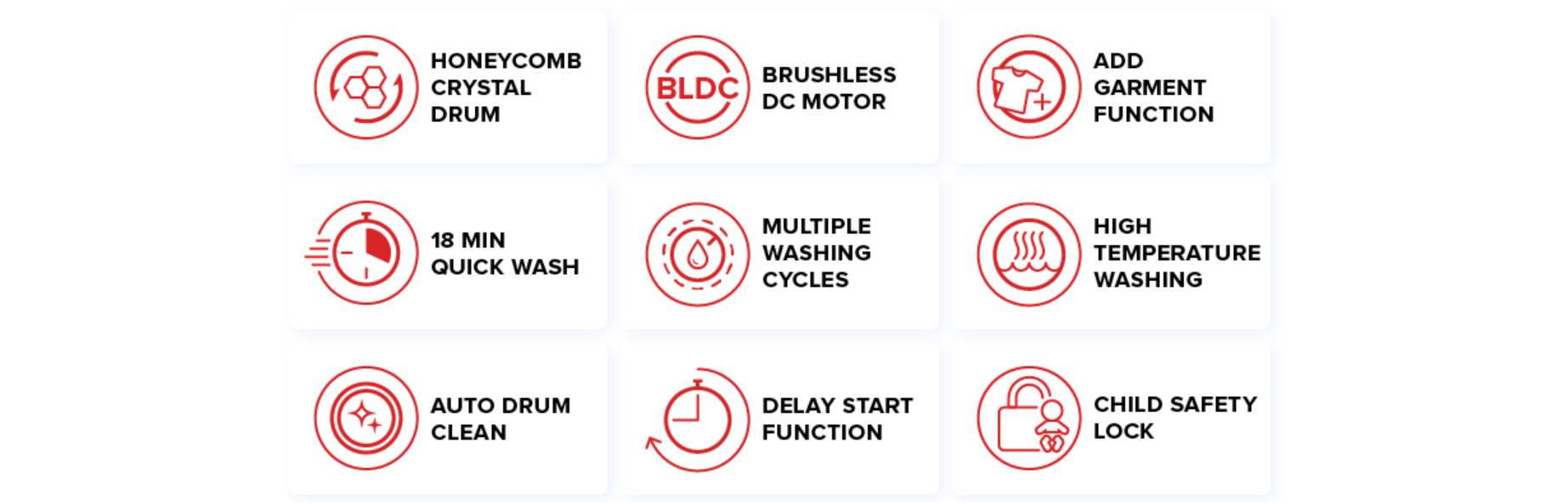 Making sure your clothes are clean and fresh is now easier than ever with TCL's P-Series washing Machines. From a large, innovative honeycomb drum design and a super-quiet Brushless DC motor, to 16 washing programs and an Add Garment Function, you'll discover a range of features that give you a great wash every time.