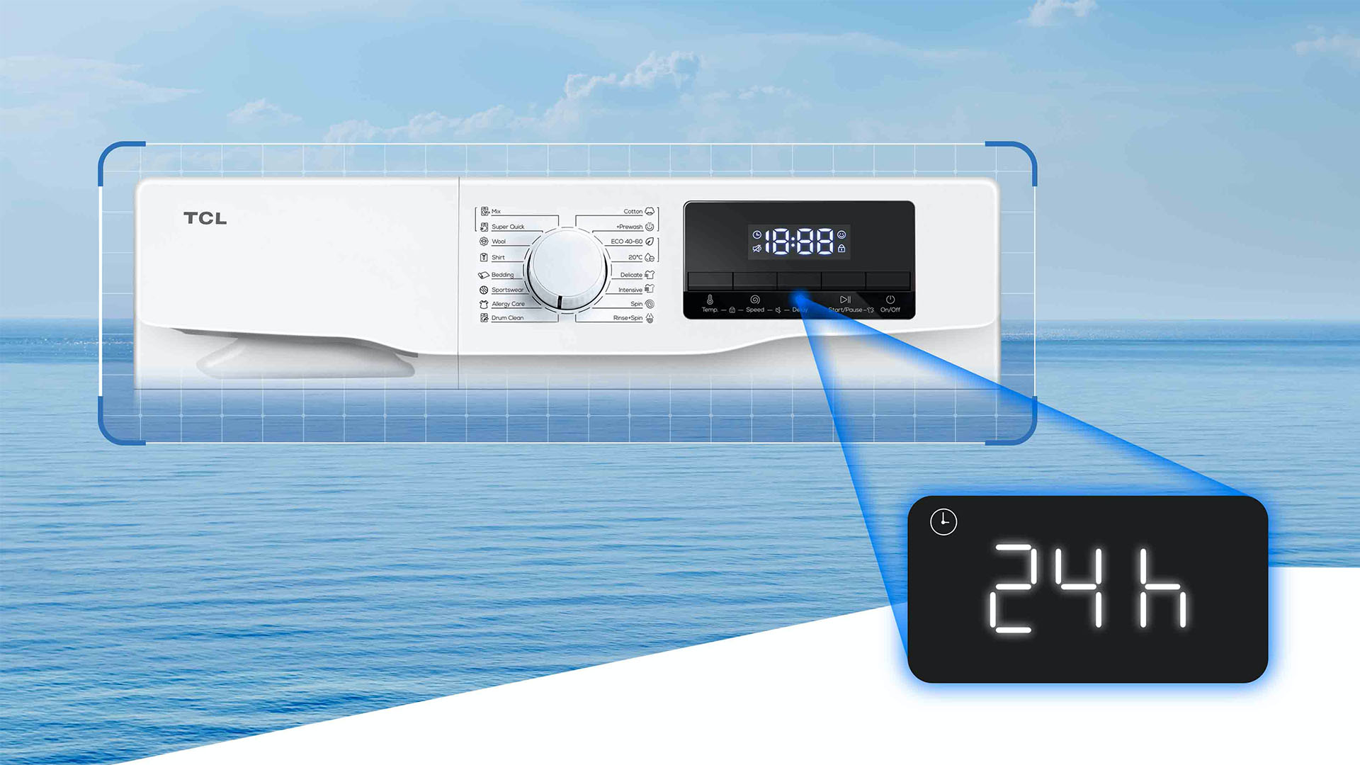 Pratique, une touche option vous permet de sélectionner l'heure de fin de votre cycle de lavage. Programmez la fin du lavage jusqu'à 24 heures à l'avance. Il vous suffit de décider quand vous souhaitez que votre cycle se termine et la machine à laver calcule automatiquement l'heure de départ.
