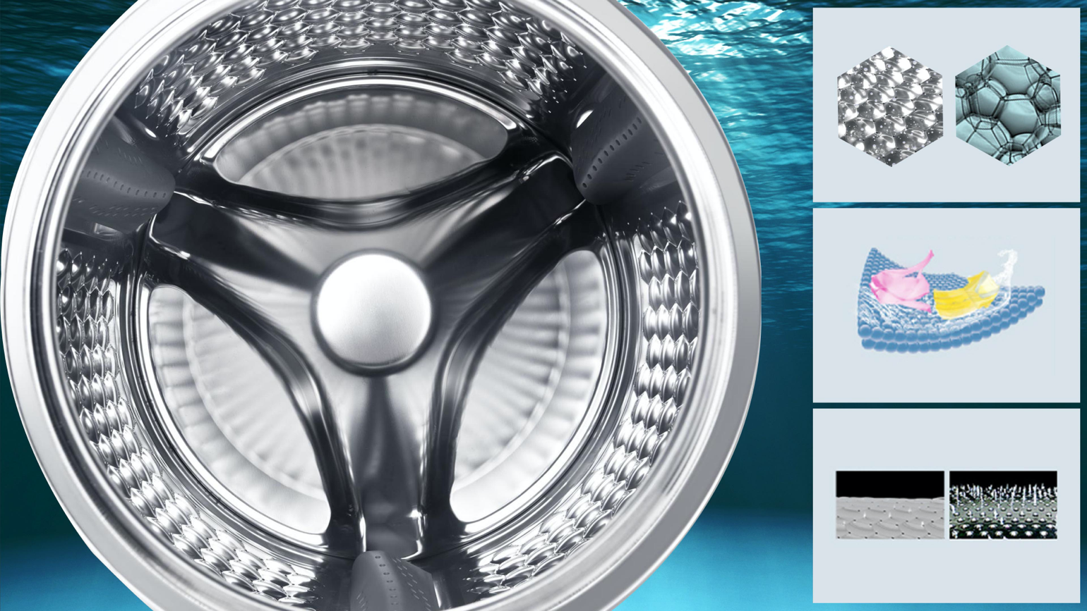 Propre à TCL, le tambour en nid d'abeille hexagonal est conçu pour éliminer même les tâches les plus difficiles, tout en restant doux pour les tissus délicats. Le tambour bénéficie d'une surface destinée à préserver vos tissus les plus délicats, peu importe le nombre de fois où vous les lavez. La conception en nid d'abeille provoque un film d'eau pour protéger vos vêtements pendant le lavage : lorsque le tambour tourne, votre linge glisse doucement à sa surface ; aucun risque d'accroc sur vos tissus les plus délicats.