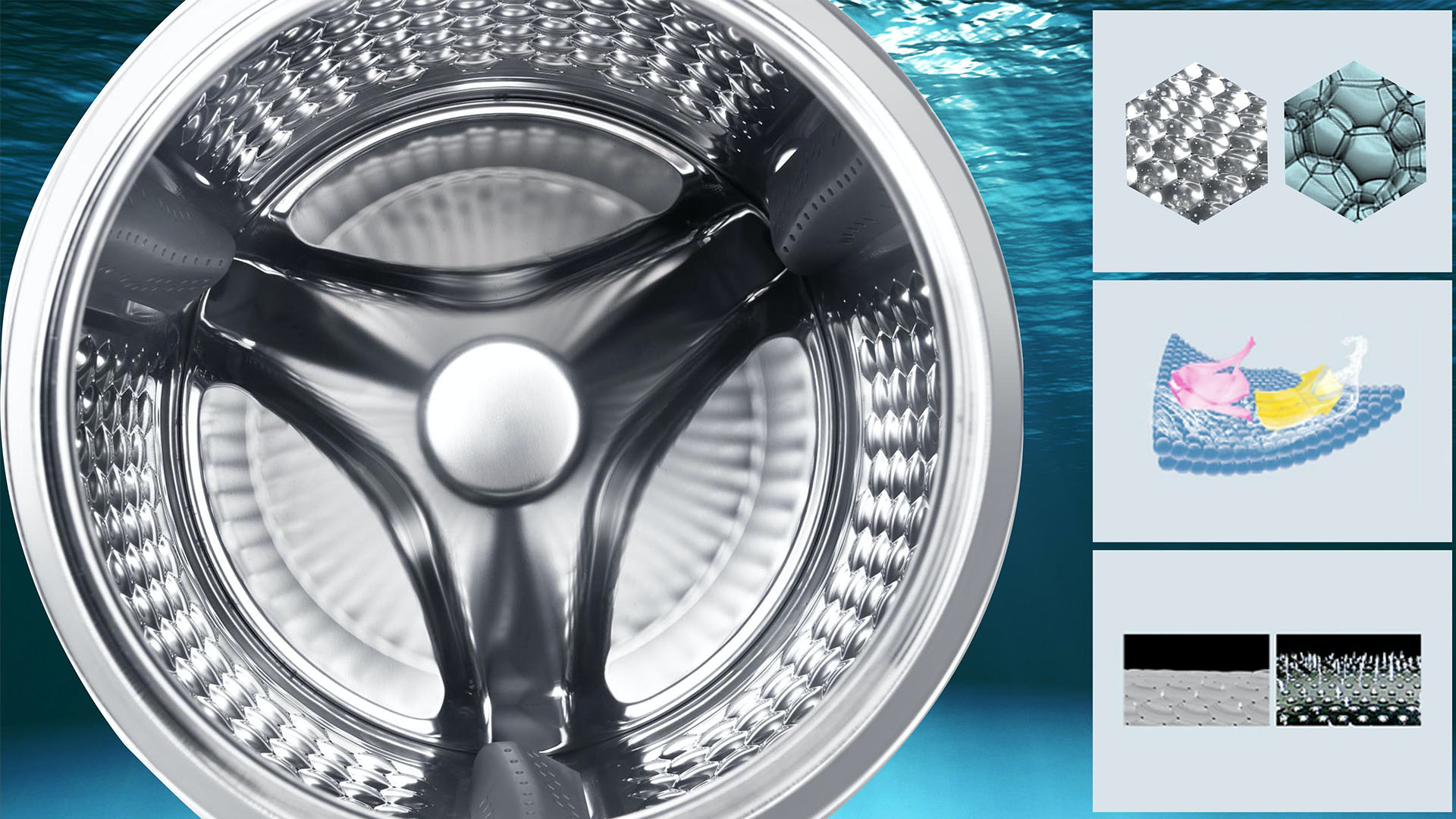 Propre à TCL, le tambour en nid d'abeille hexagonal est conçu pour éliminer même les tâches les plus difficiles, tout en restant doux pour les tissus délicats. Le tambour bénéficie d'une surface destinée à préserver vos tissus les plus délicats, peu importe le nombre de fois où vous les lavez. La conception en nid d'abeille provoque un film d'eau pour protéger vos vêtements pendant le lavage : lorsque le tambour tourne, votre linge glisse doucement à sa surface ; aucun risque d'accroc sur vos tissus les plus délicats.