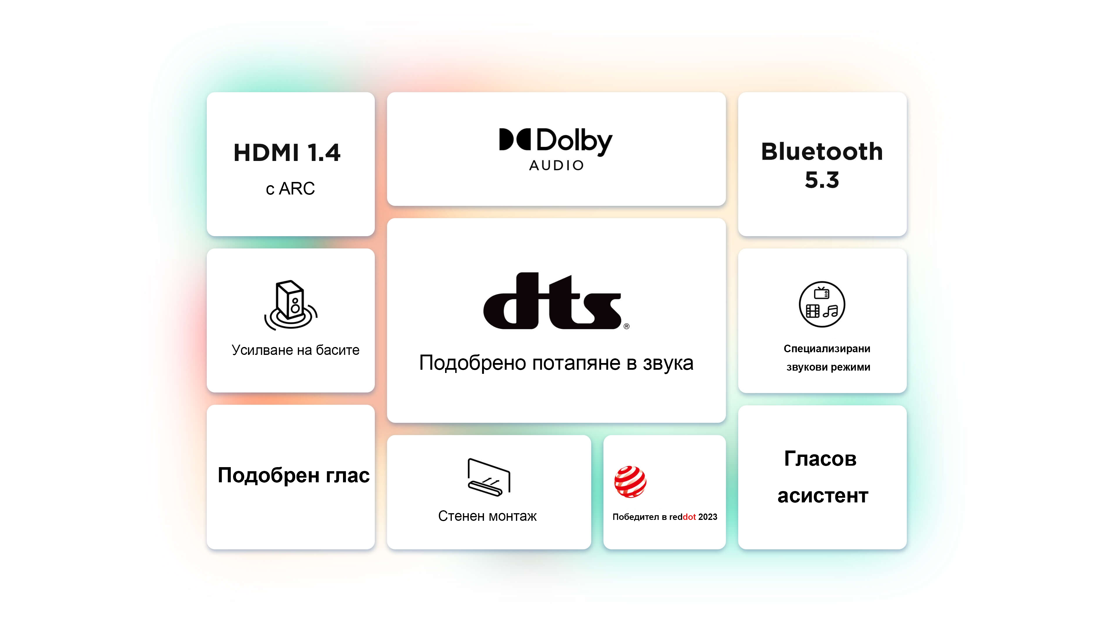 *DTS:X, Virtual X и DTS логата са регистрирани търговски марки или търговски марки на DTS, Inc. в Съединените щати и други страни. © 2022 DTS, Inc. ВСИЧКИ ПРАВА ЗАПАЗЕНИ.