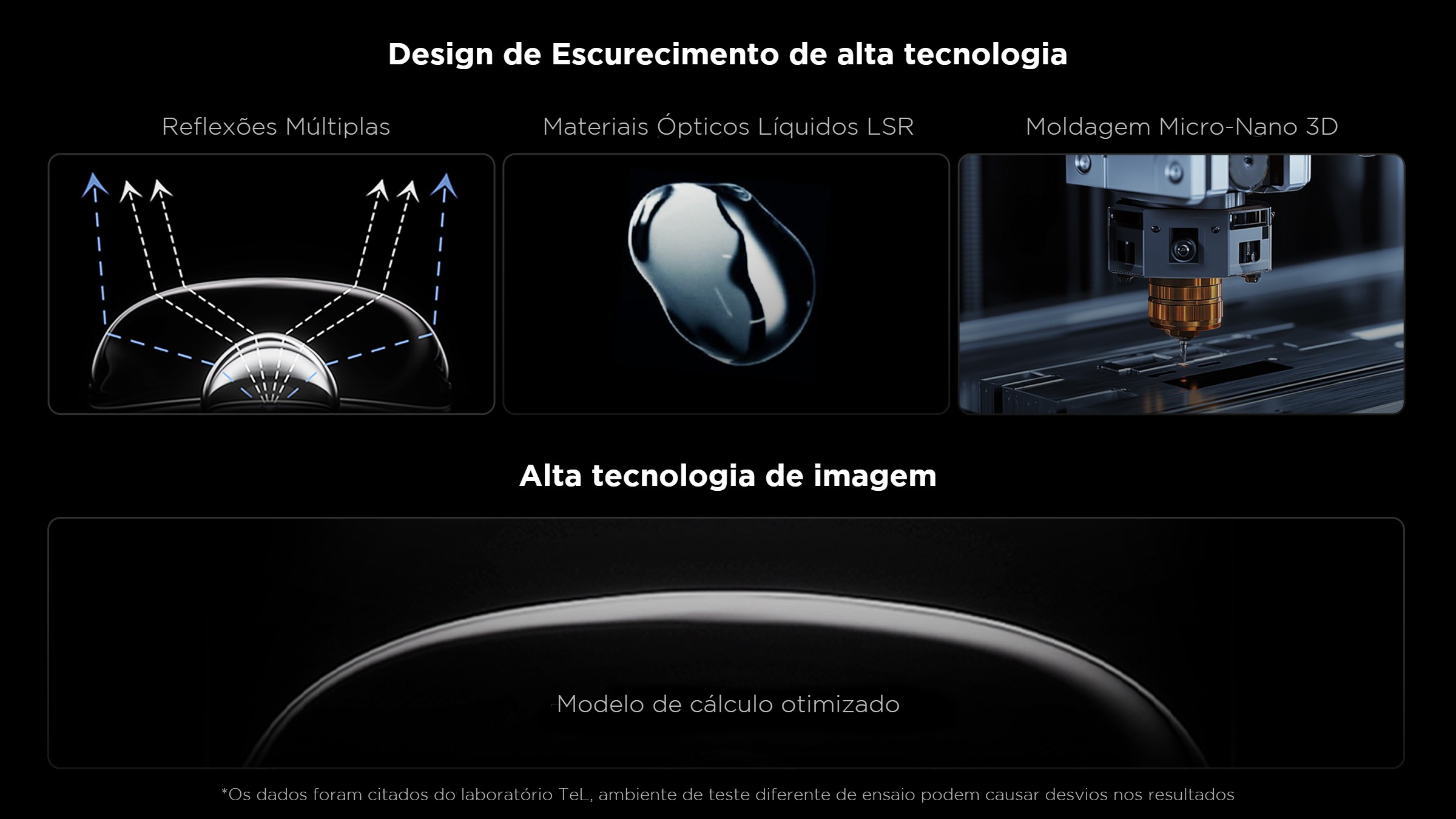 Potente chip emissor de luz | Microlente condensada | Micro-OD | Algoritmo Biônico de Iluminação