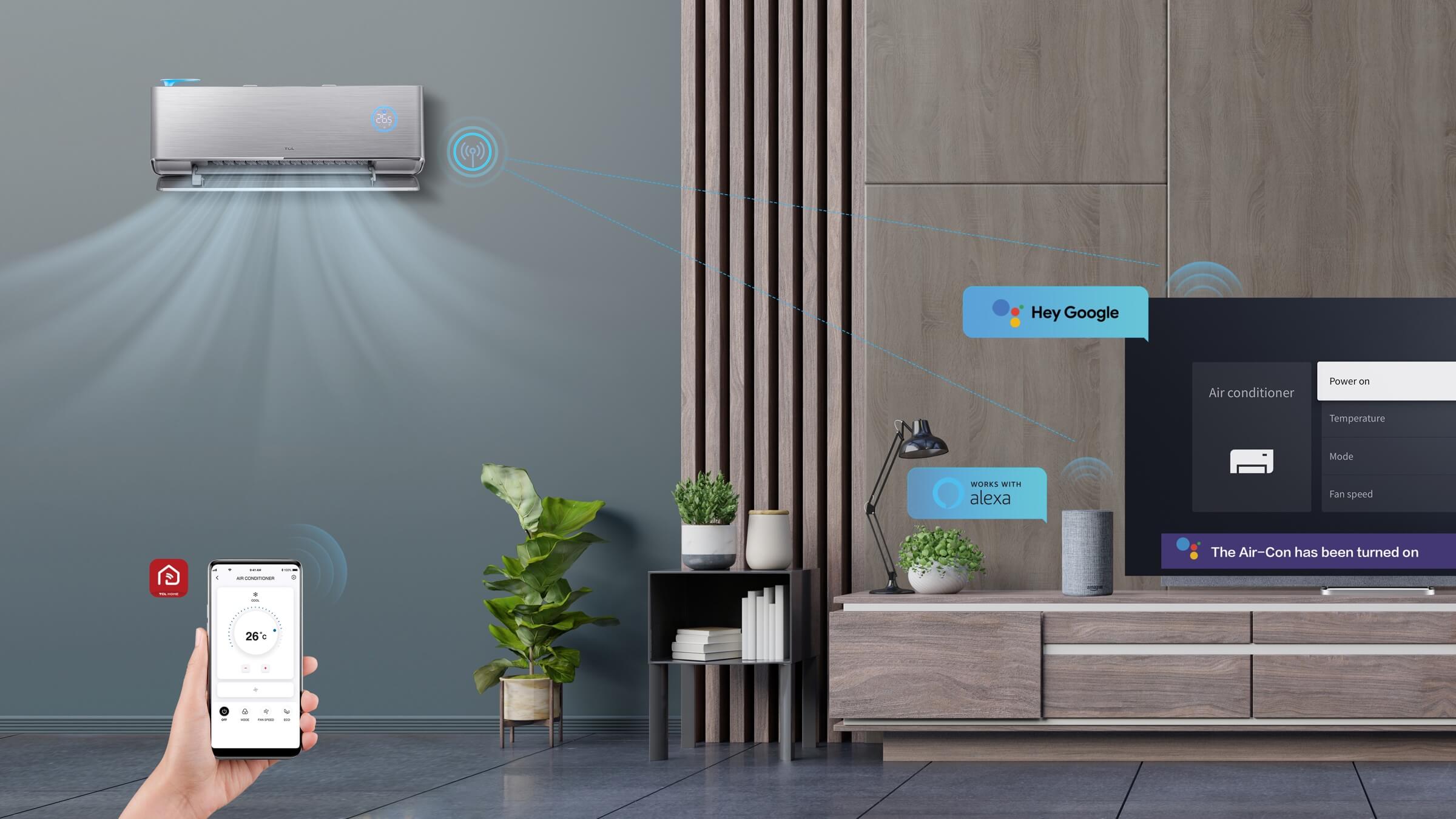 Управление осуществляется с помощью универсального приложения TCL Home App для кондиционеров и других электроприоборов TCL. Приложение позволяет управлять всеми имеющимися функциями у кондиционера через смартфон или планшет, в том числе с помощью голосовых команд. Также с промощью приложения возможно контролировать объем свежего воздуха поступающего в помещение в режиме реального времени.