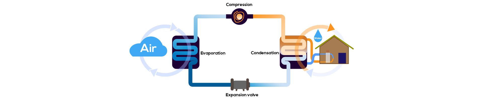 ① Verdampfung: Der Verdampfer ist der Ort, an dem Kältemittel und Aussenluft Wärme austauschen. Das Kältemittel wird dabei von flüssig zu gasförmig, während es die Wärme aus der Luft aufnimmt.