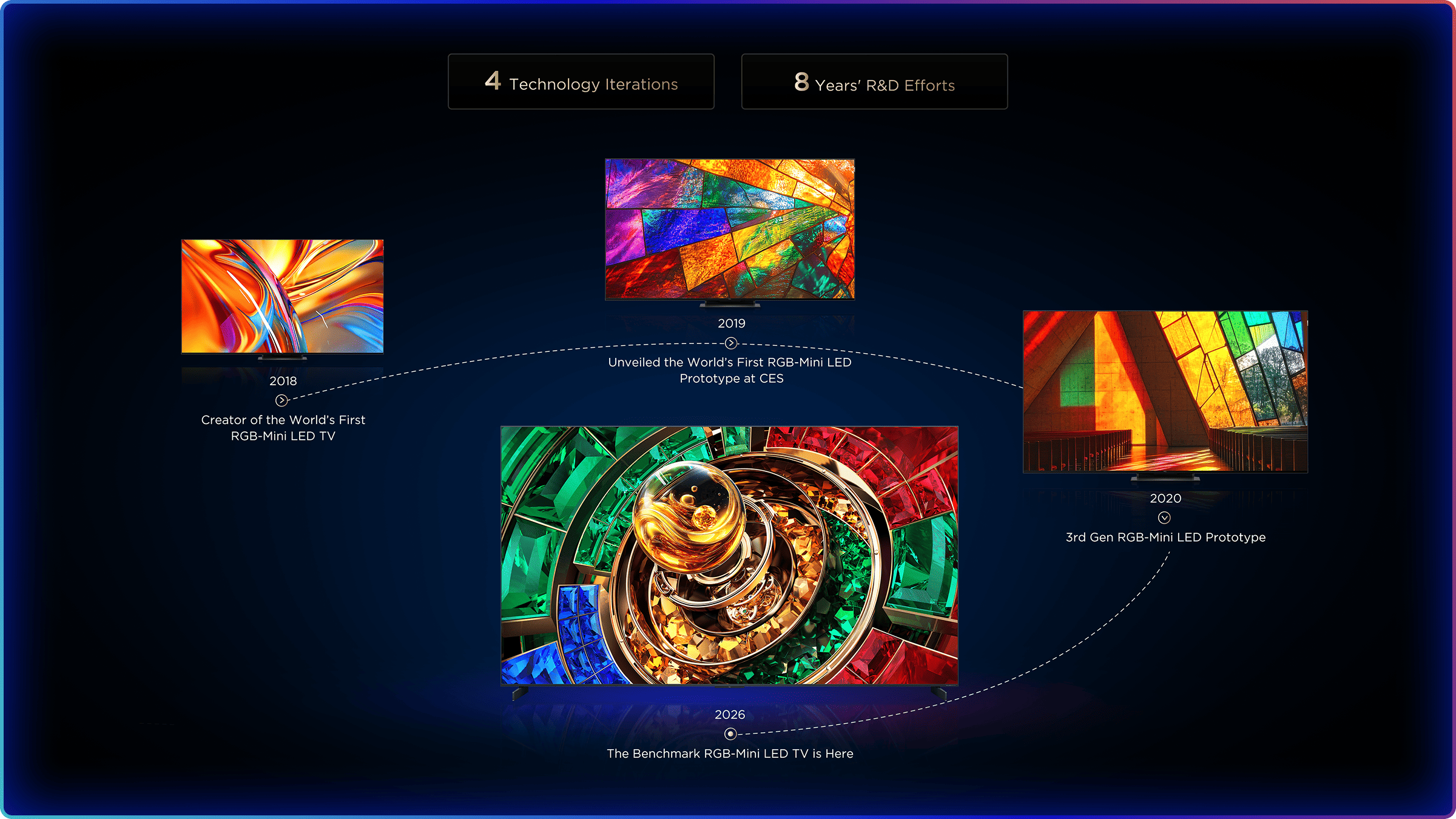 TCL sets the benchmark for RGB-Mini LED display technology. TCL's RGB precision dimming technology achieves a full-chain breakthrough, from the RGB chips to the screen. It significantly resolves the industry-wide challenge of color crosstalk, delivering light and color performance that is far superior to conventional RGB-Mini LED TVs.