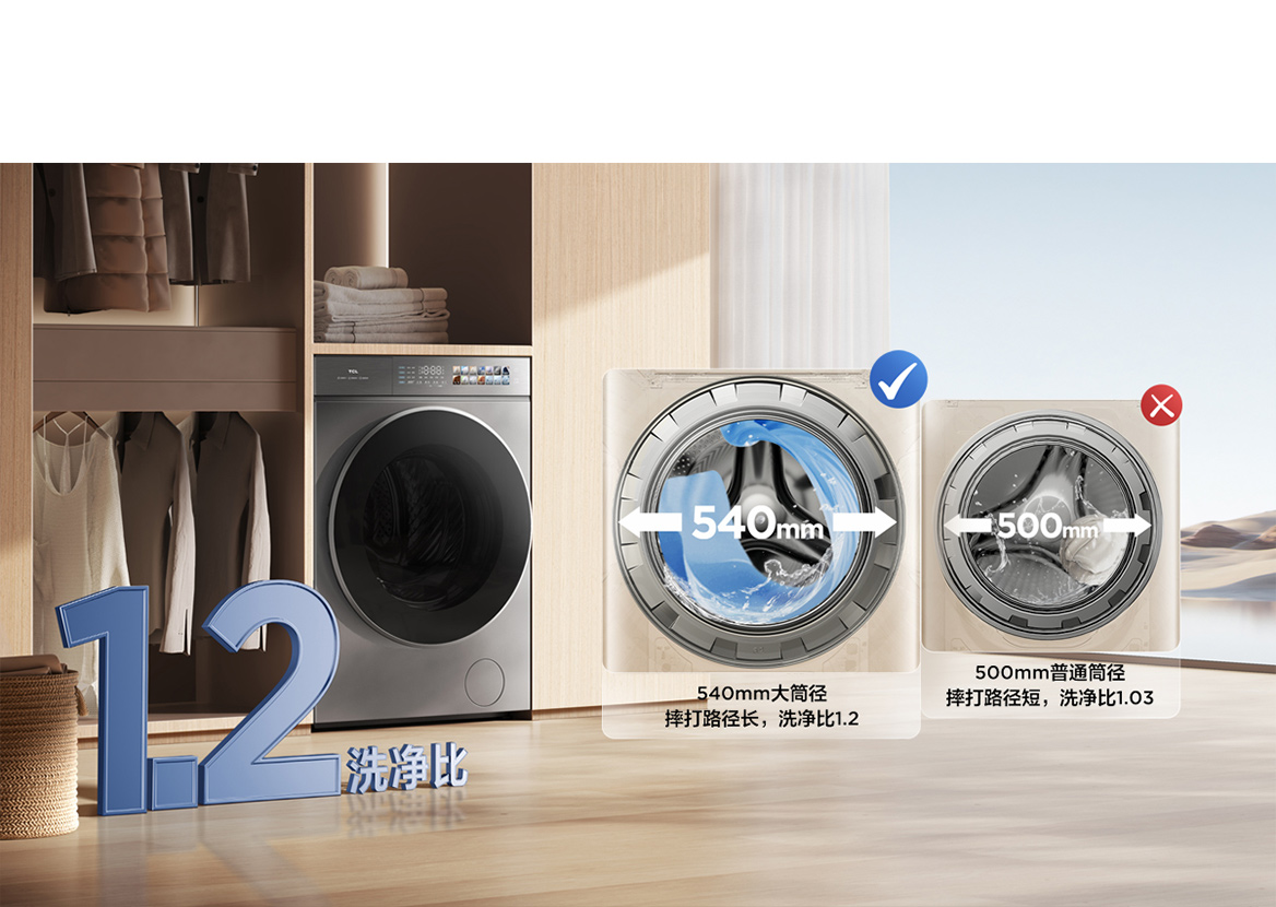 ● 1.2洗净比:TCL滚筒洗衣机P7超级筒通过独特的超级筒技术实现了业界领先的1.2洗净比,为用户提供了更加健康的洗衣方式。