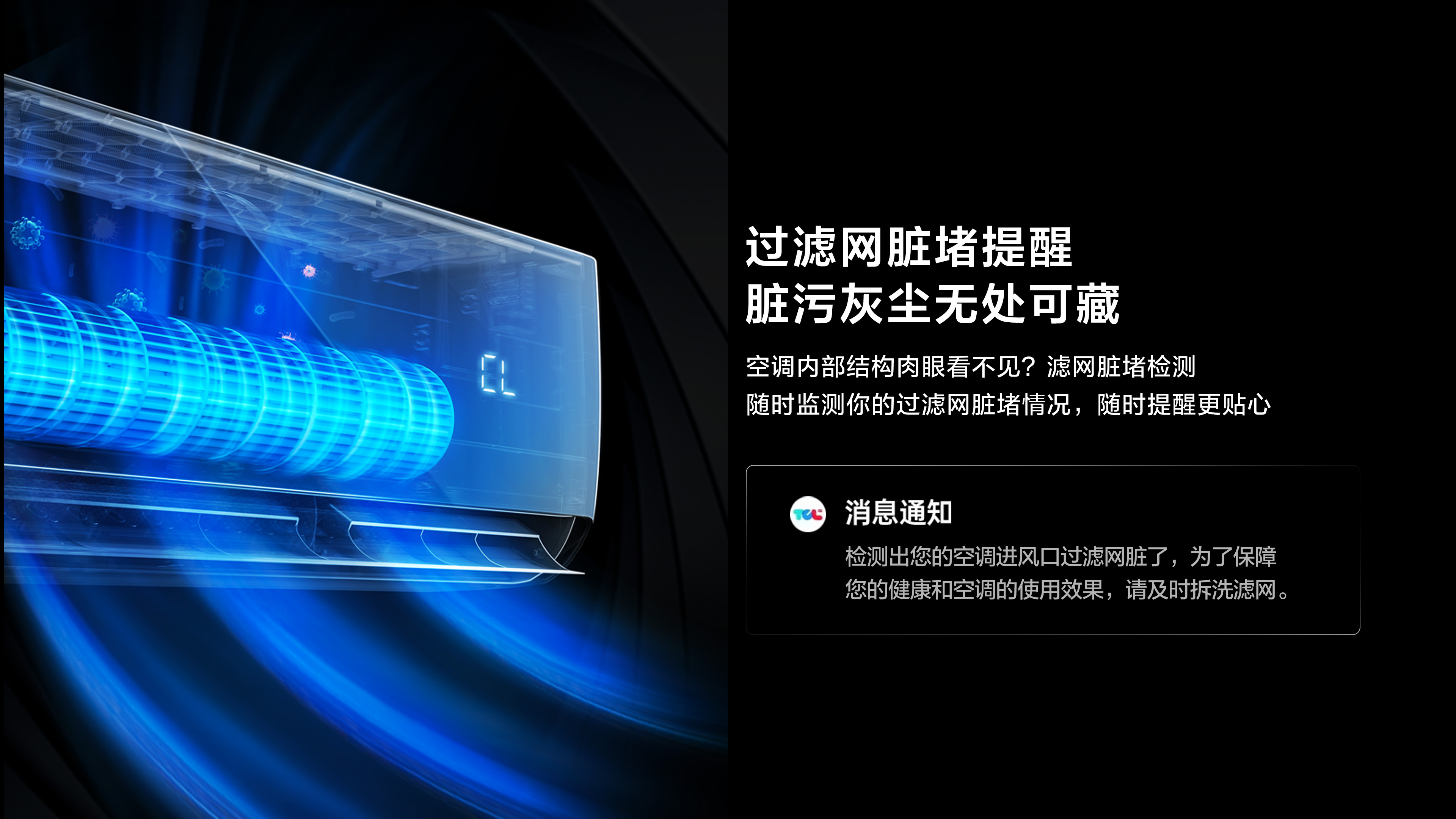 除此之外,现在的空调常常搭载智能技术,比如TCL新一级能效变频冷暖挂机,不仅能高效制冷,更支持了APP远程开关和控制空调,还能自动播报脏堵提醒,实现智能化操作,预防室内机漏水问题。