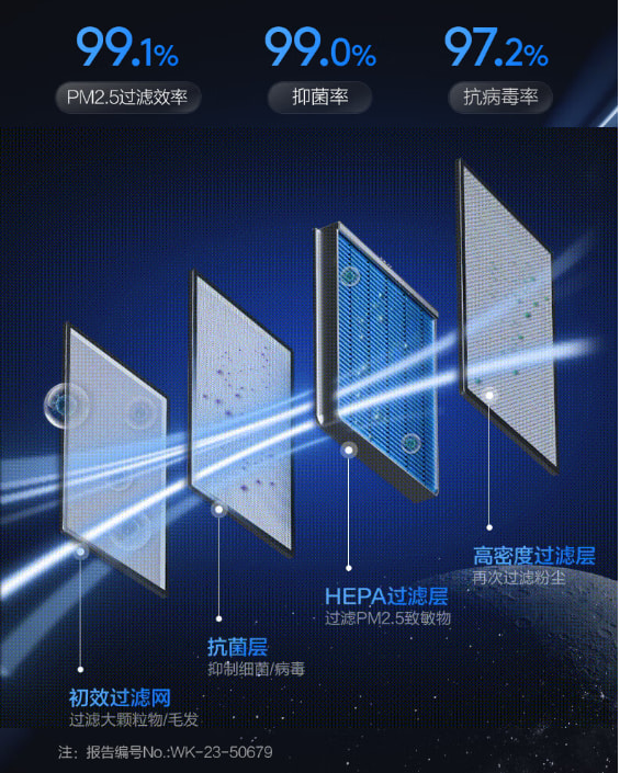 TCL小蓝翼P7新风空调特制四重 HEPA 滤芯,搭配纳米级大小滤孔,层层过滤 PM2.5、细菌病毒等其他污染物,拥有99.1%的PM2.5过滤效率、99.0%的抑菌率、97.2%的抗病毒率,大大缓解呼吸焦虑,唤醒自在呼吸。