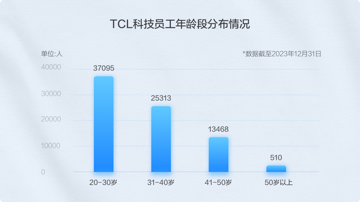 我们的公司充满年轻的活力,年轻人在我们团队中占据着重要的地位。截至2023年12月31日,TCL科技员工中年龄20-30 周岁人数高达37095,31-40周岁人数25313、41-50 周岁人数13468、50 周岁以上人数510。公司氛围年轻化,充满创意和激情。我们坚信年轻人拥有独特的见解和创新思维,因此,我们愿意为年轻人提供广阔的机会,让他们在这个充满活力的环境中充分发挥潜力。无论是参与创新项目、提出新的理念,还是在职业发展上追求更高的高度,我们欢迎年轻人在这里找到属于自己的舞台,共同成就未来的成功。