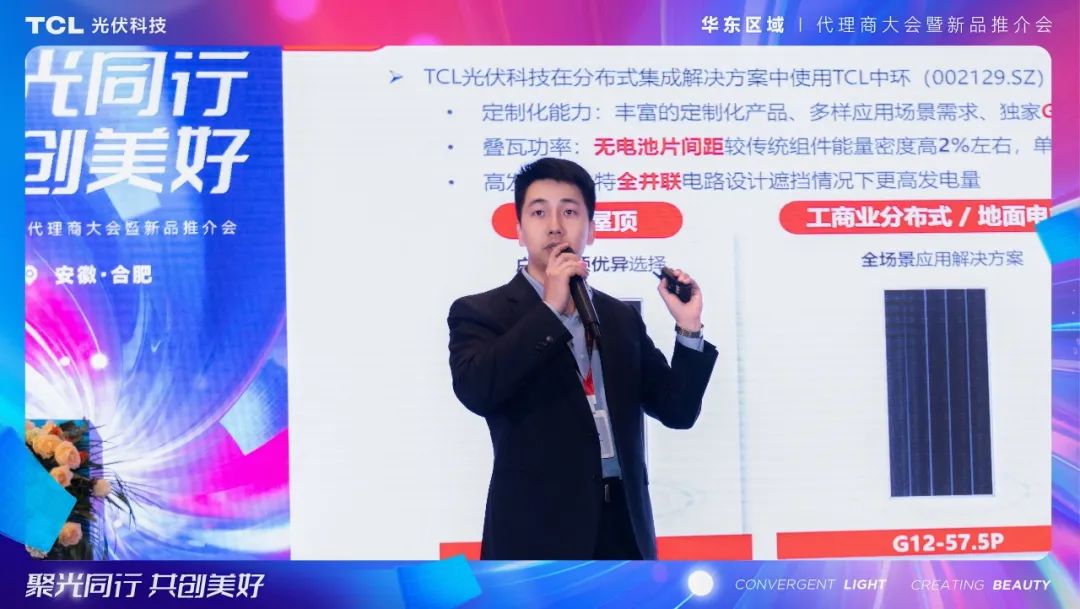 前述竞争优势助力TCL光伏科技的工商业业务与户用业务齐头并进,多面开花。TCL光伏科技华东区总监钱勇向与会代理商介绍了工商业业务及电站开发案例,依托光伏投、建、运、售一站式服务能力,TCL光伏科技具有EMC(合同能源管理模式)、EPC+F(融资租赁)模式、EPC和全额上网四种合作模式,覆盖BIPV、厂房屋顶、渔光互补、农光互补、光伏车棚以及智慧储能等多场景施工能力和经验,方便工商业主根据自身用能需求灵活选择,量身定制。