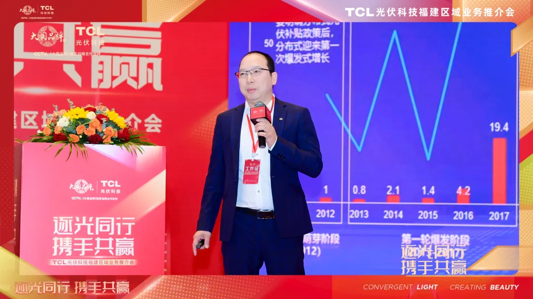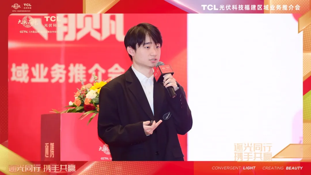 紧接着,TCL光伏科技户用福建总经理杨凯深度剖析了福建户用光伏市场的潜力。他回顾了分布式光伏的发展、历程,指出市场驱动已成为主导力量,装机增长势头强劲。福建地区作为光伏应用的重要市场,开发潜力巨大,正迎来快速发展的新时期。随着国家政策对提升可再生能源替代率的大力倡导,至2025年,城镇建筑可再生能源替代率及新建建筑屋顶光伏覆盖率均有望得到大幅提升,特别是在厦门、漳州、泉州等太阳能资源丰富地区。同时,他分享了TCL光伏科技产品在业内的差异化优势及竞争力,为市场蓬勃发展提供了有力支撑。