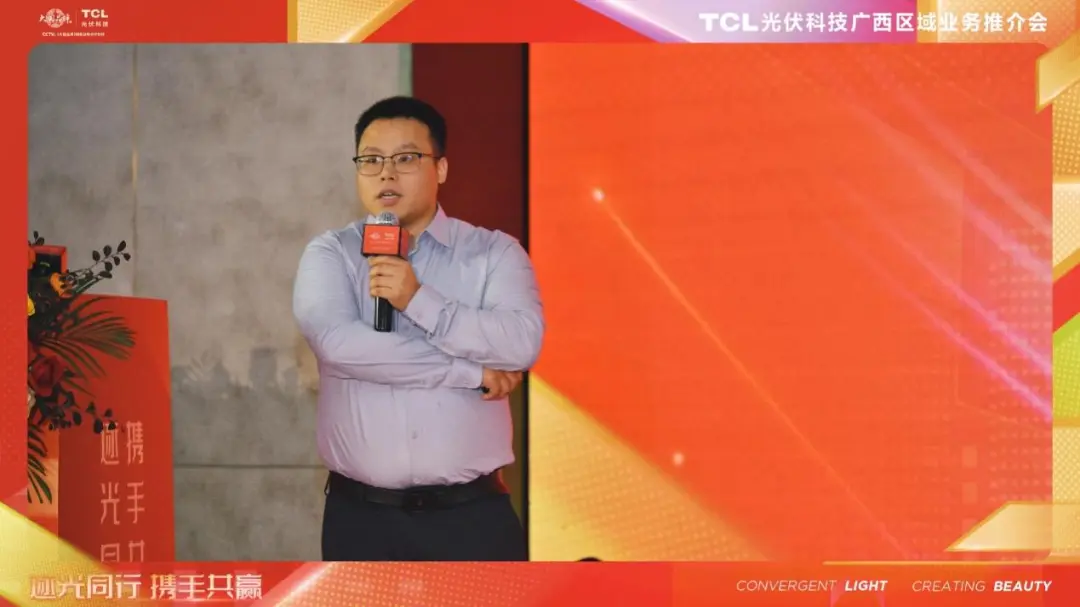 TCL光伏科技户用广西总经理李龙敏、TCL光伏科技市场推广负责人卢靖尧、TCL光伏科技商用华南大区副总经理张海洋、TCL光伏科技广西技术负责人丁文等领导和嘉宾上台发表演讲。