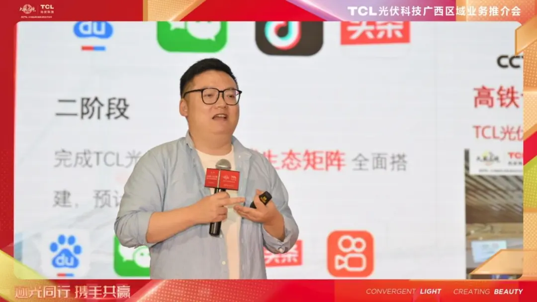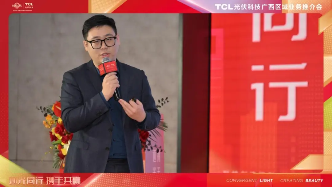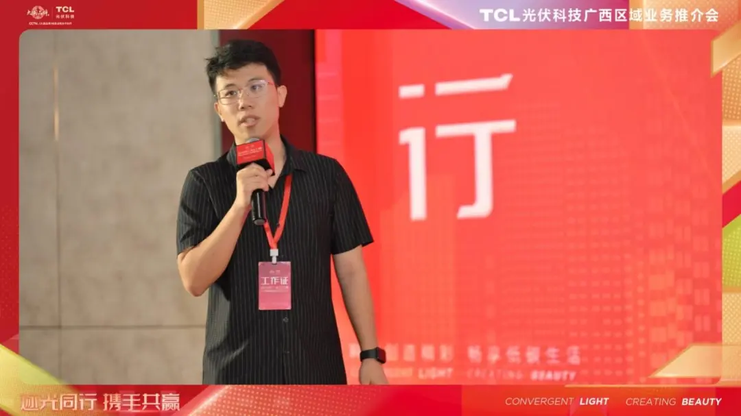 会议现场,TCL光伏科技市场推广负责人卢靖尧首先发表演讲,为嘉宾们全面介绍TCL集团在智能终端、半导体显示和新能源光伏这三大核心领域的谋篇布局,并重点阐述了TCL光伏科技的相关业务。当前,TCL光伏科技不仅在产品性能和品牌影响力方面有差异化优势,并且通过建立完善的产业链生态,打通了从整合上游供应链资源到精准触达下游用户的各关键环节,并通过多元的营销生态矩阵为代理商赋能,助其快速开拓市场。