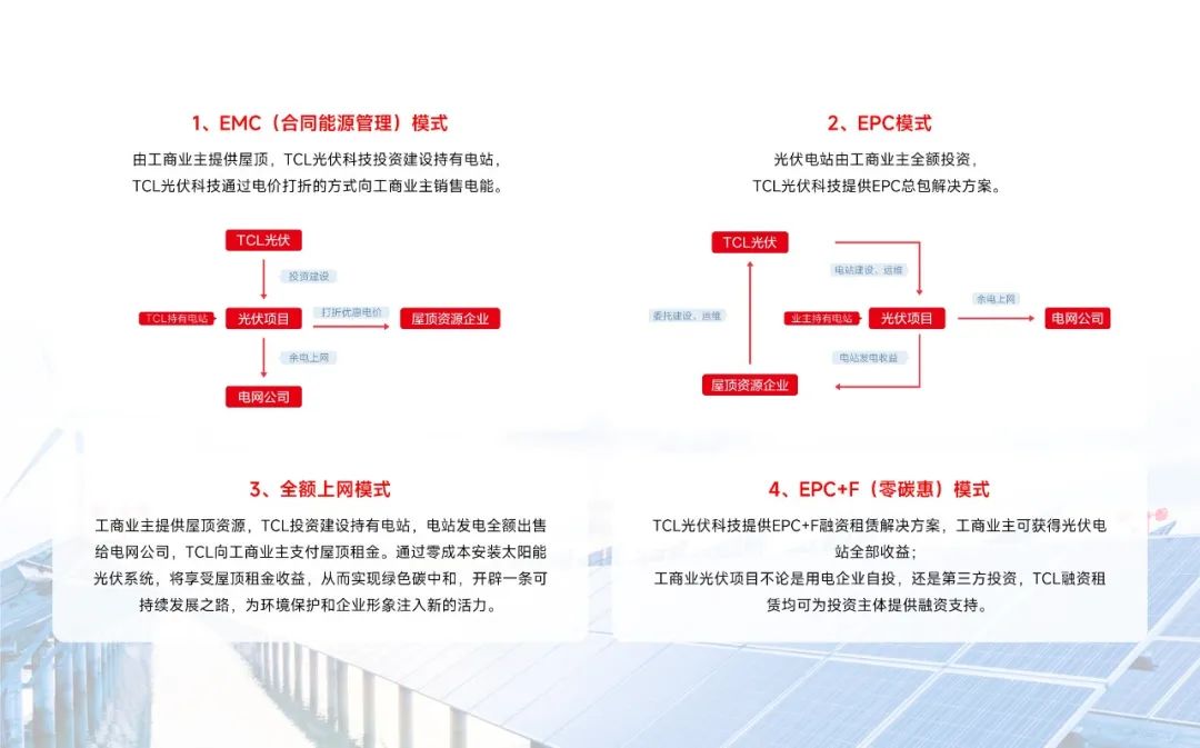 为更好地为企业主提供清洁能源解决方案,TCL光伏科技目前有EMC(合同能源管理模式)、EPC+F(融资租赁)模式、EPC和全额上网等四种合作模式,具有了多场景的施工能力,如BIPV、厂房屋顶、渔光互补、农光互补、光伏车棚以及智慧储能等,能够根据业主需求,出具专业的定制化方案。
