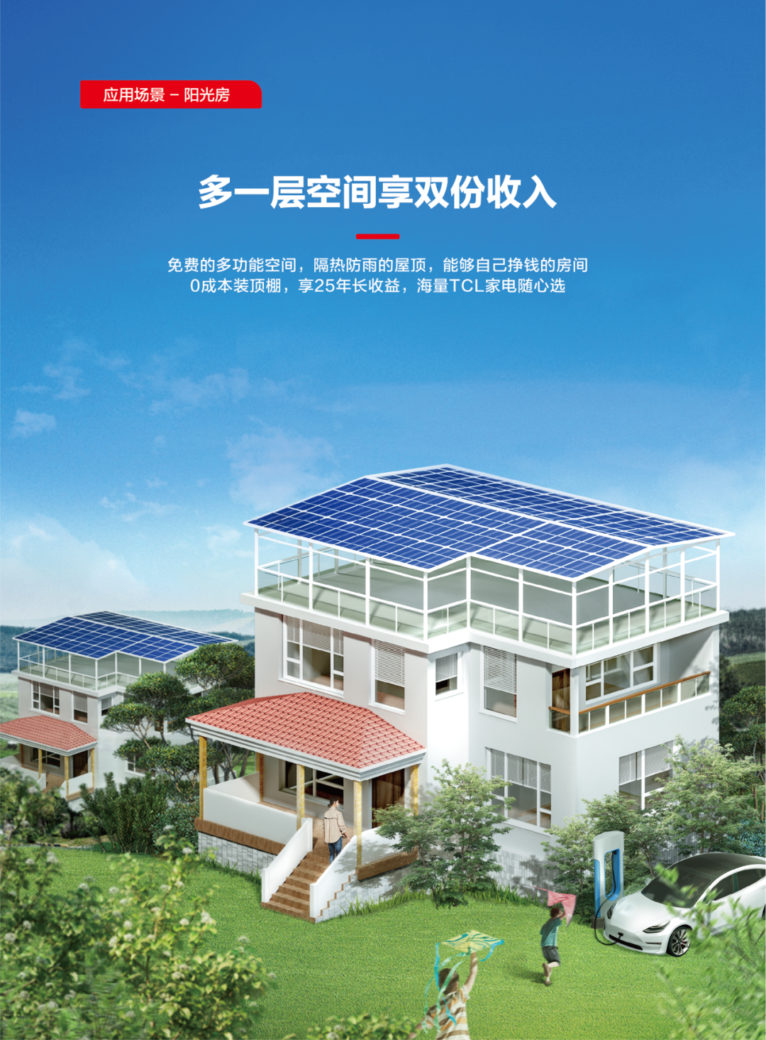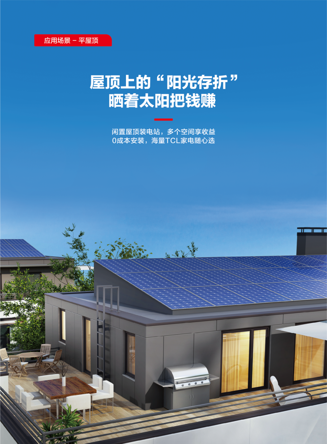 随着户用光伏的兴起和普及,用户对于户用光伏电站的适用场景及收益模式的需求也在与时俱进。TCL光伏科技从户用光伏实际场景出发,提供适用于平屋顶、斜屋顶、阳光房、庭院房等场景的户用光伏系统智能解决方案。