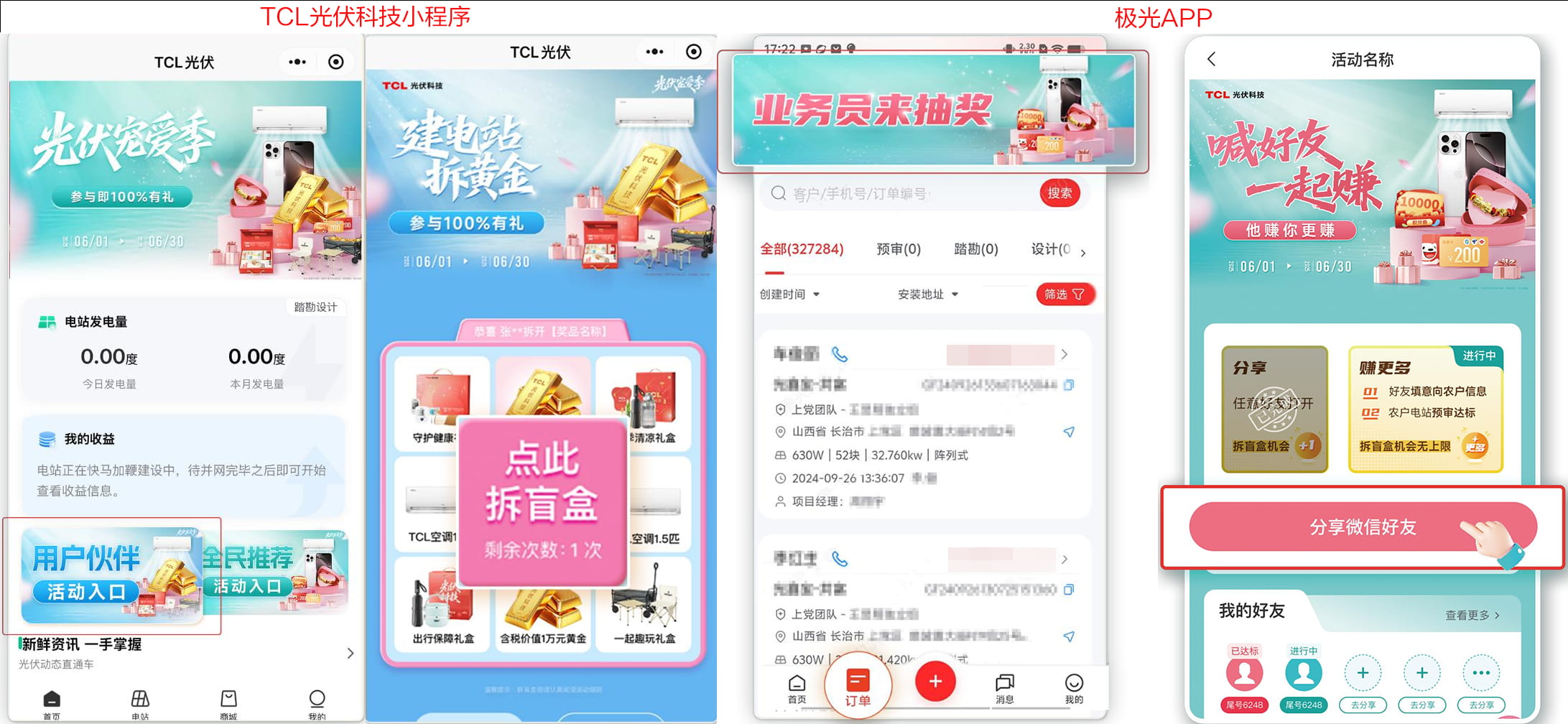 作为深耕光伏领域的领军企业,TCL光伏科技立足乡村振兴与能源结构转型的时代需求,致力于让绿色能源惠及更多民众。此次“光伏宠爱季”活动以“用户拆盲盒+业务员激励+全民推荐+分享裂变”四大核心玩法,借助“极光APP+小程序”双平台,构建线上化全流程闭环服务体系,大幅提升行业服务效率。