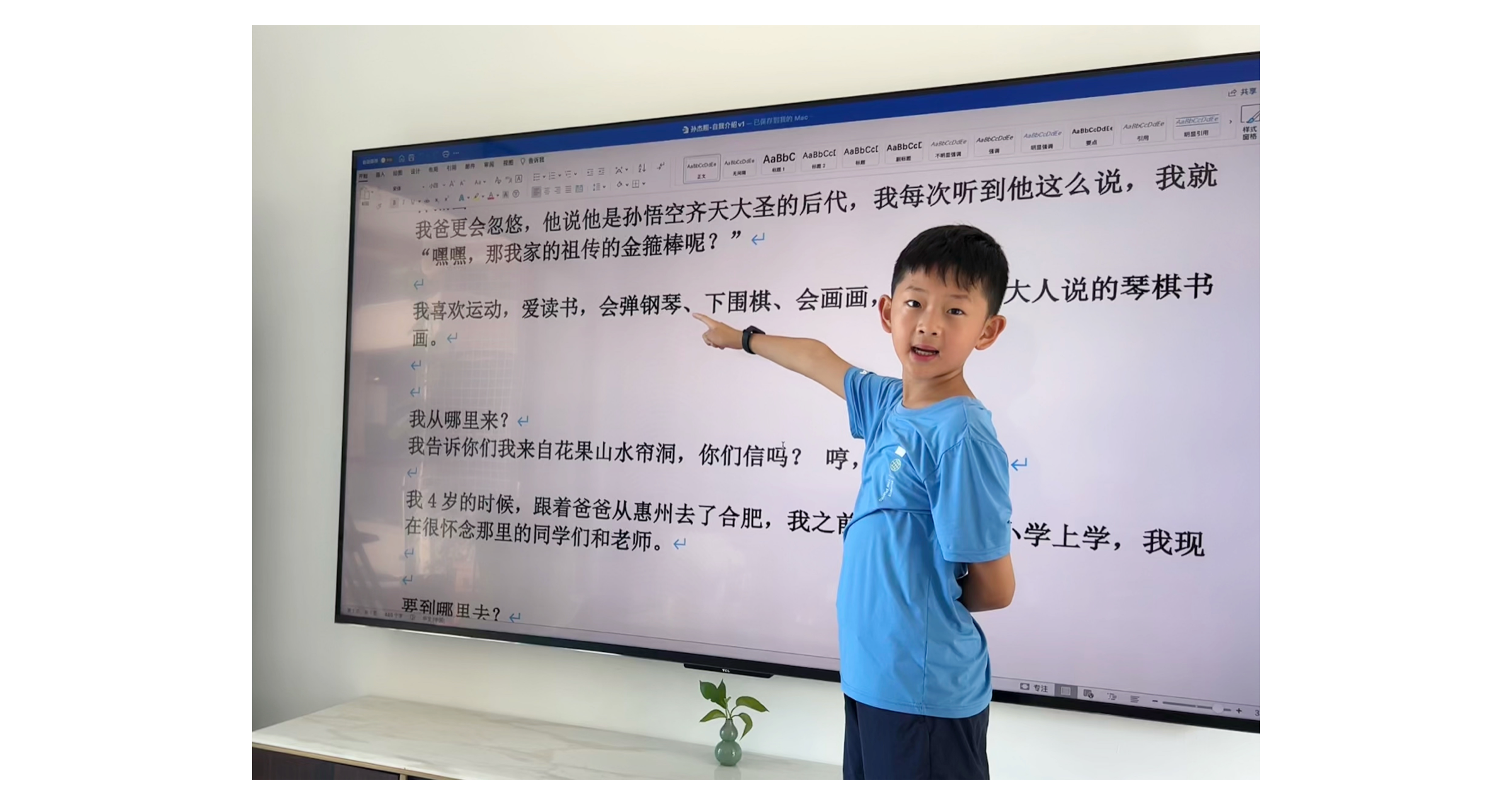 “下面请听一号选手熙熙的自我介绍……”新买的98吋电视大屏上出现了他自己做好的PPT。讲到兴奋时,儿子干脆放下讲稿。跟着屏幕上的PPT指引讲述,俨然一副小讲师的模样。接着,他又用电视打开了word文档,给我们看他写的作文。他左手背在身后,右手指着电视大屏,讲起了故事。