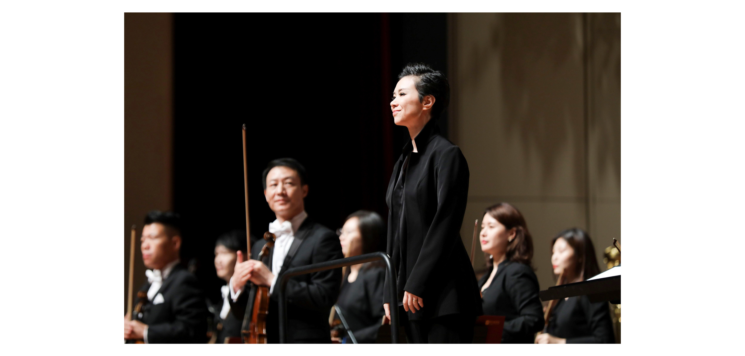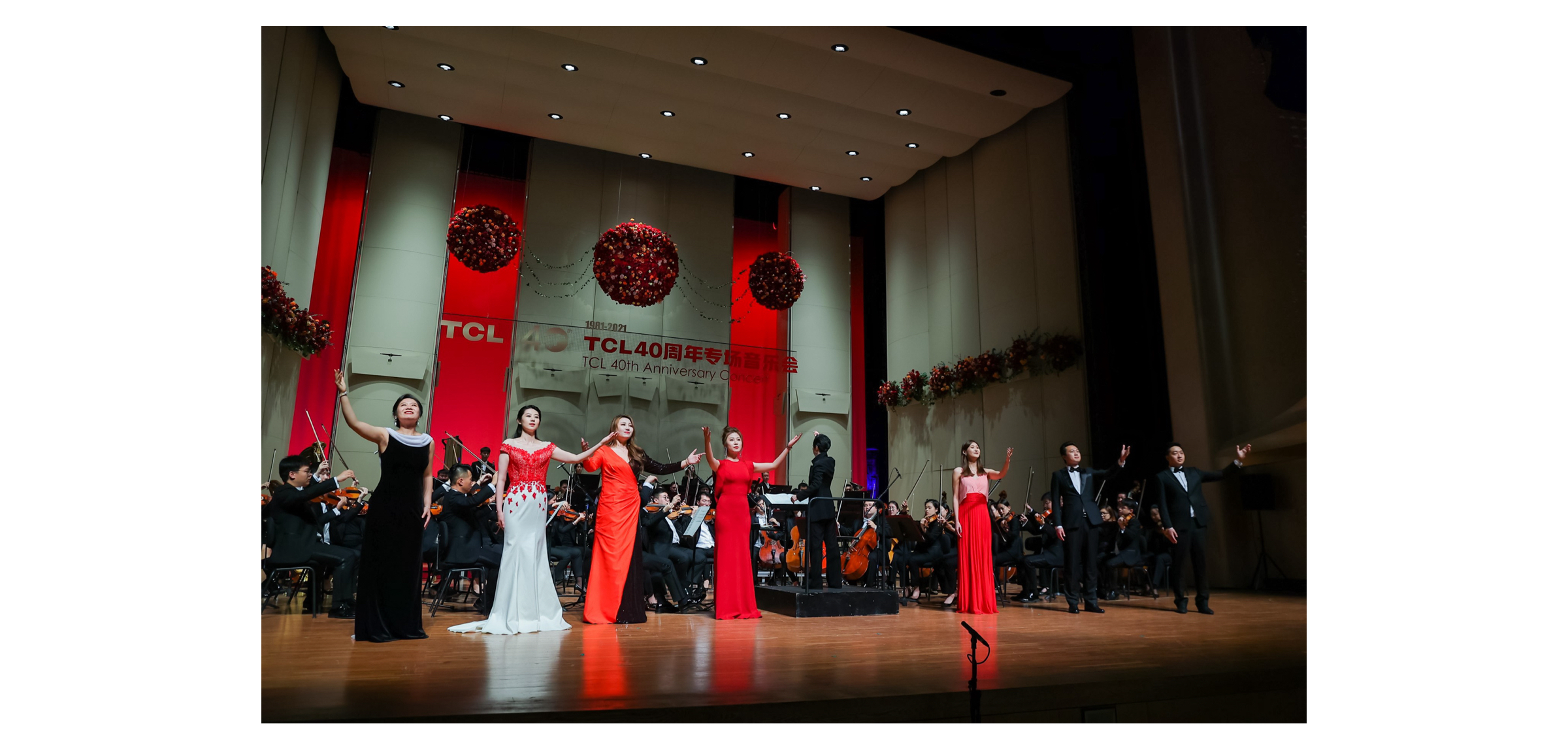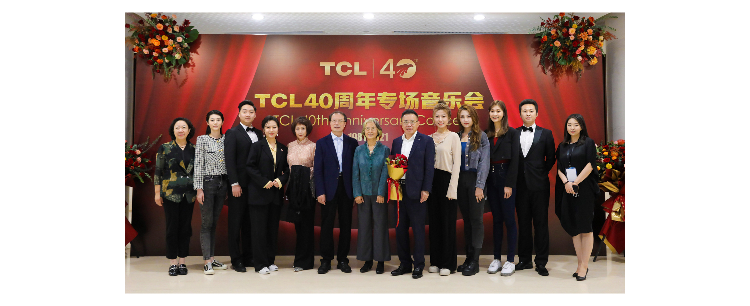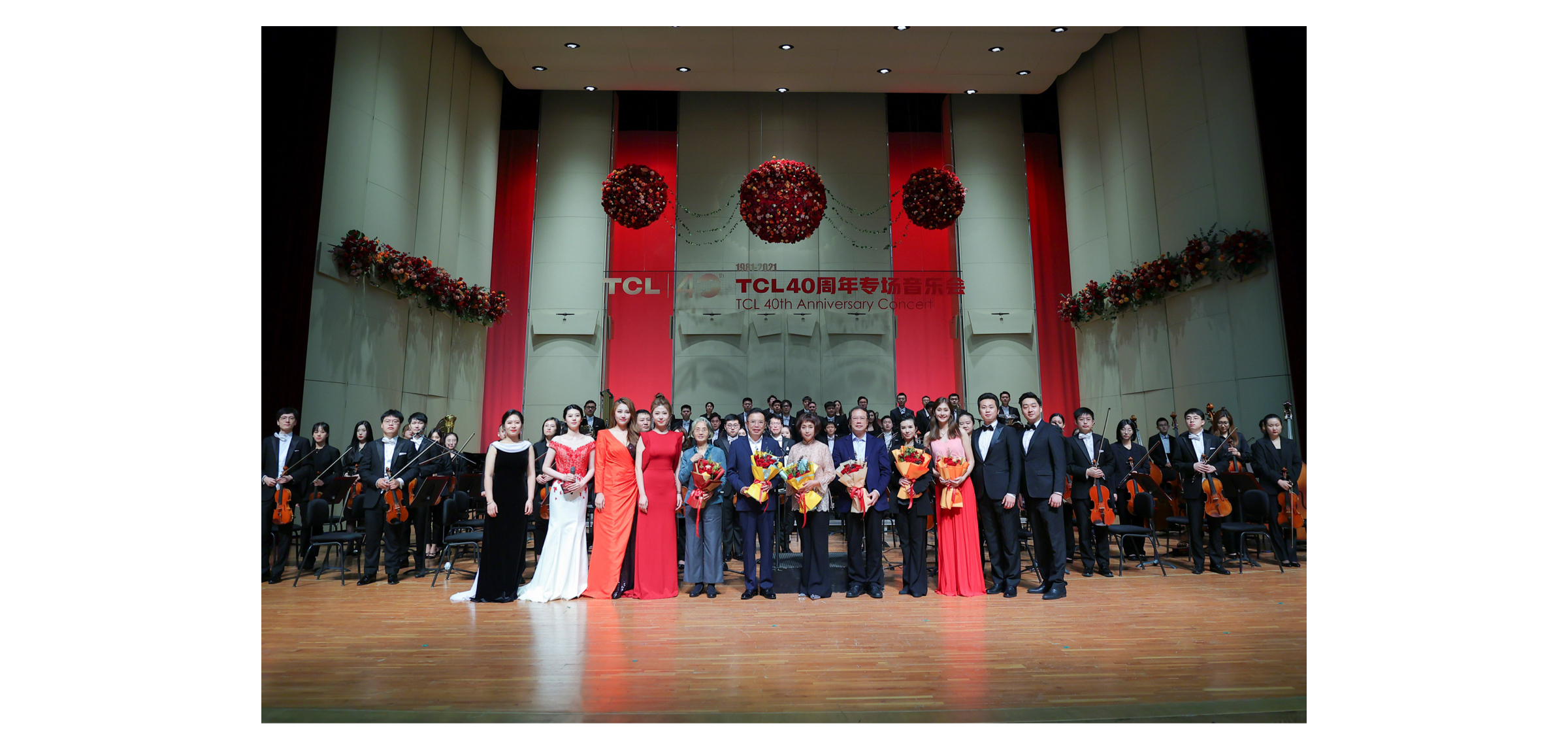 TCL创始人、董事长李东生先生,央音党委书记赵旻先生,央音教育基金会理事长郭淑兰女士,TCL科技副总裁、TCL公益基金会执行理事长魏雪女士与乐团合影