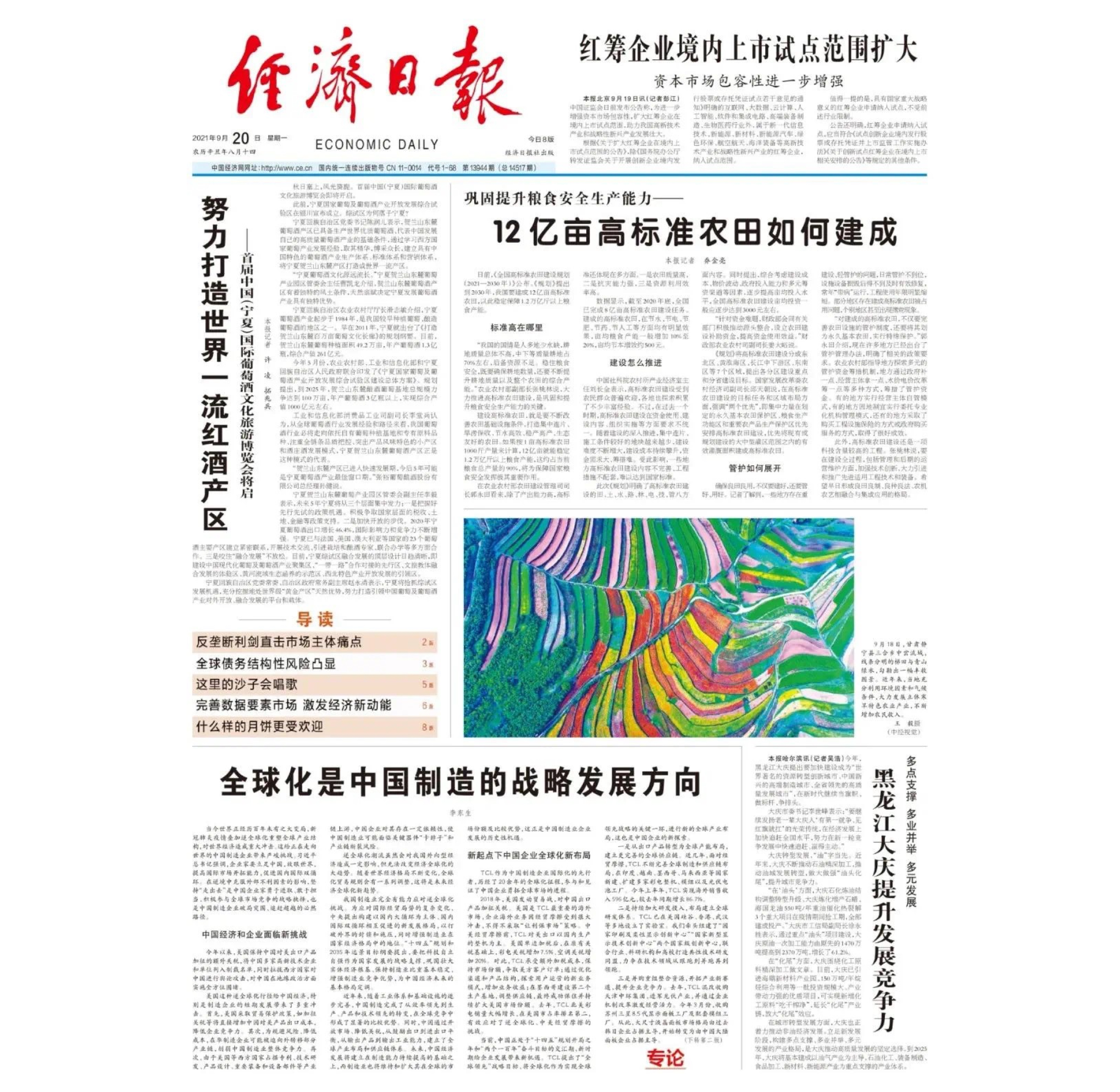 2021年9月20日,中央直属党报《经济日报》头版发表全国工商联副主席、TCL董事长李东生的署名文章《全球化是中国制造的战略发展方向》。李董认为,当今世界正经历百年未有之大变局,这给正在走向世界的中国制造企业带来了严峻挑战。在逆境中克服外部不利因素的影响,坚持“走出去”是中国企业家勇于进取、敢于担当,积极参与全球市场竞争的战略抉择,也是中国制造企业破局突围、追赶超越的必然路径。
