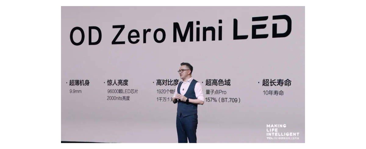 2021年3月,在“春季发布会”上,TCL同时推出了两款Mini LED系列电视——TCL首款OD Zero Mini LED(领曜)智屏和TCL C12量子点Mini LED 智屏。其中领曜智屏采用了最新OD Zero Mini LED技术,被誉为行业显示巅峰之作:全球首款OD Zero Mini LED智屏、全球最薄的 Mini LED智屏、搭载最多LED芯片的 Mini LED智屏。