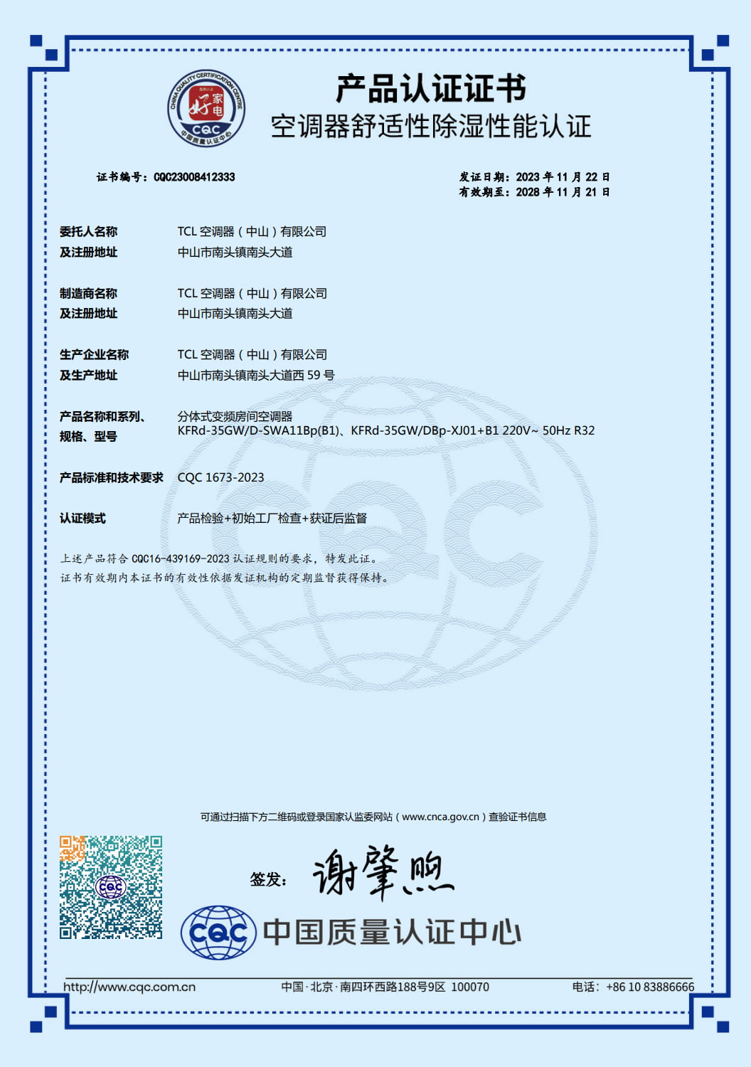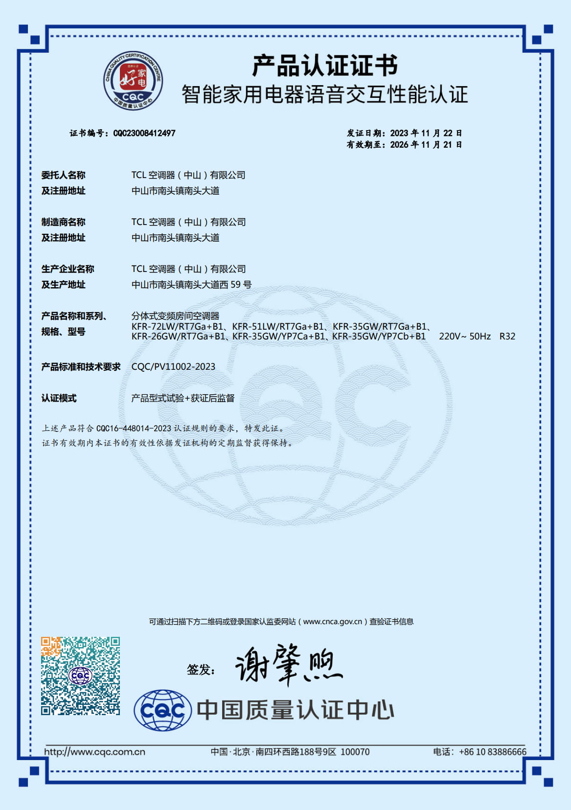2023年11月24日,中国质量认证中心发布中国首批“好家电认证”,TCL空调斩获“智能家用电器语音交互”以及“空调器舒适性除湿”两大权威性能认证。