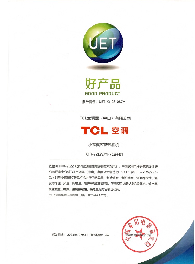 2014年5月, TCL空调“梦魅”荣获由中国家用电器研究院颁发的UET“金奖产品”称号。