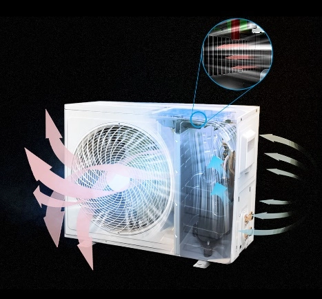 采用负压强制对流散热技术,搭载专门的风道以及精致电控盒设计,通过将室外空气直接引进给电控盒元器件散热,使电控温度不超过90℃,确保电控安全工作,实现室外50℃高温下冷量不衰减,60℃高温下空调保持强劲制冷。