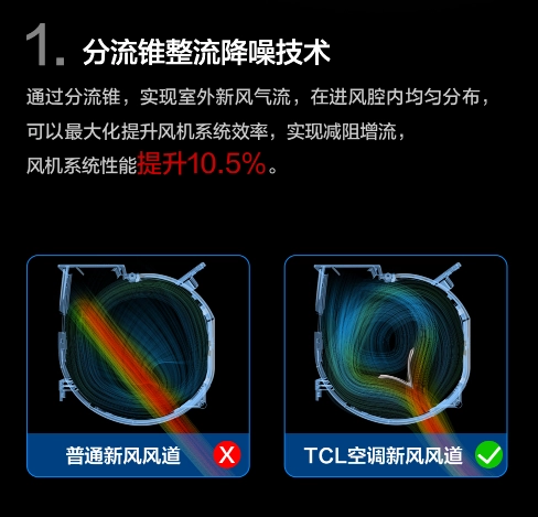 通过分流锥,实现室外新风气流,在进风腔内均匀分布可以最大化提升风机系统效率,实现减阻增流,风机系统性能提升10.5%。