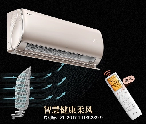 通过仿生柔风叶片、 数以千计的柔风微孔、360°自旋式运动大导风板、特殊曲面风道等设计组成柔风系统,将强劲气流转化成徐徐微风,实现空调在4.5米内高舒适柔和送风。