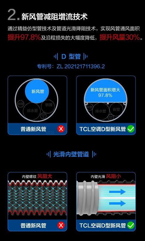 通过精益仿型管技术及管道光滑降阻技术,实现风管通风面积提升97.8%及沿程损失的大幅度降低,提升风量30%