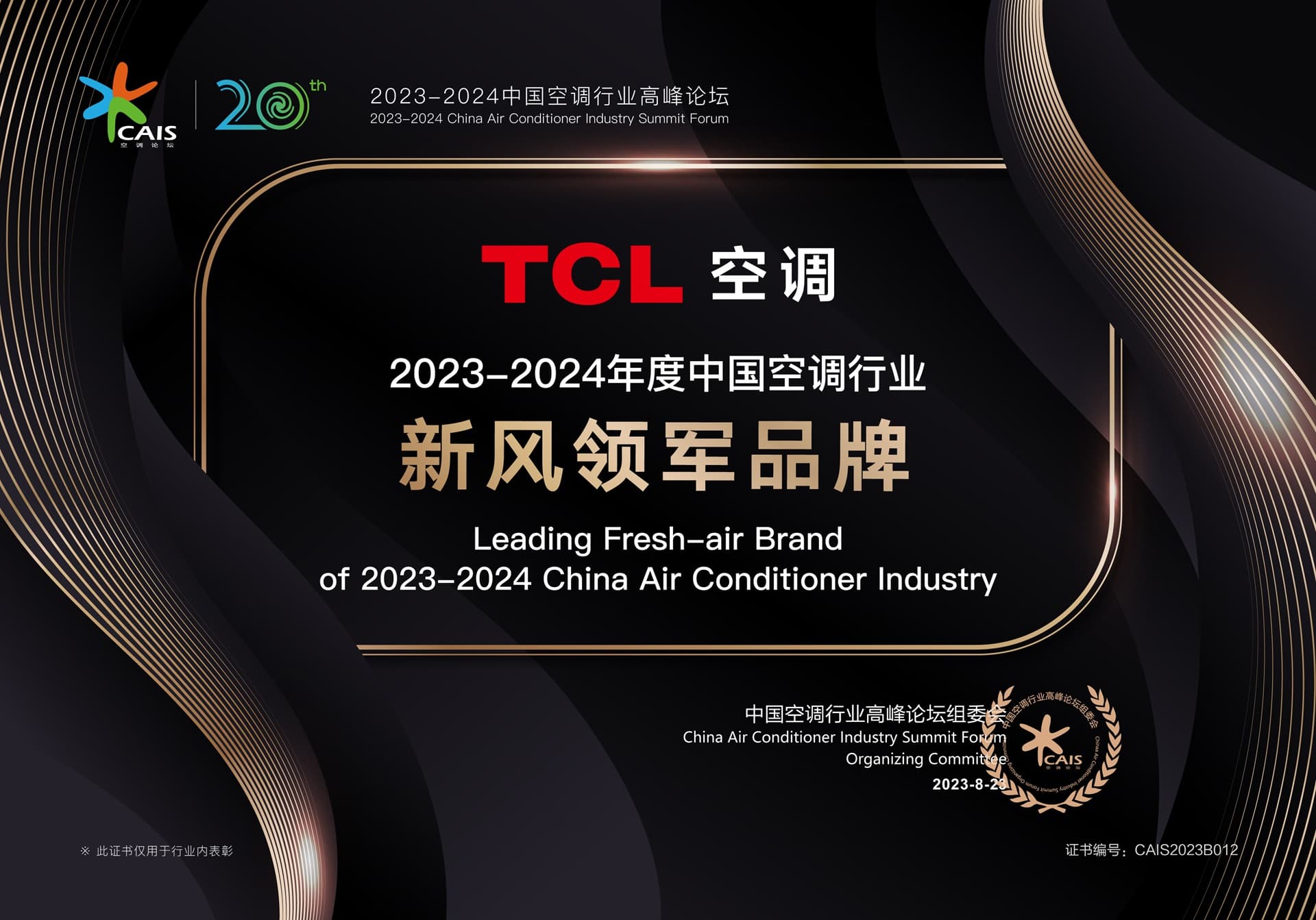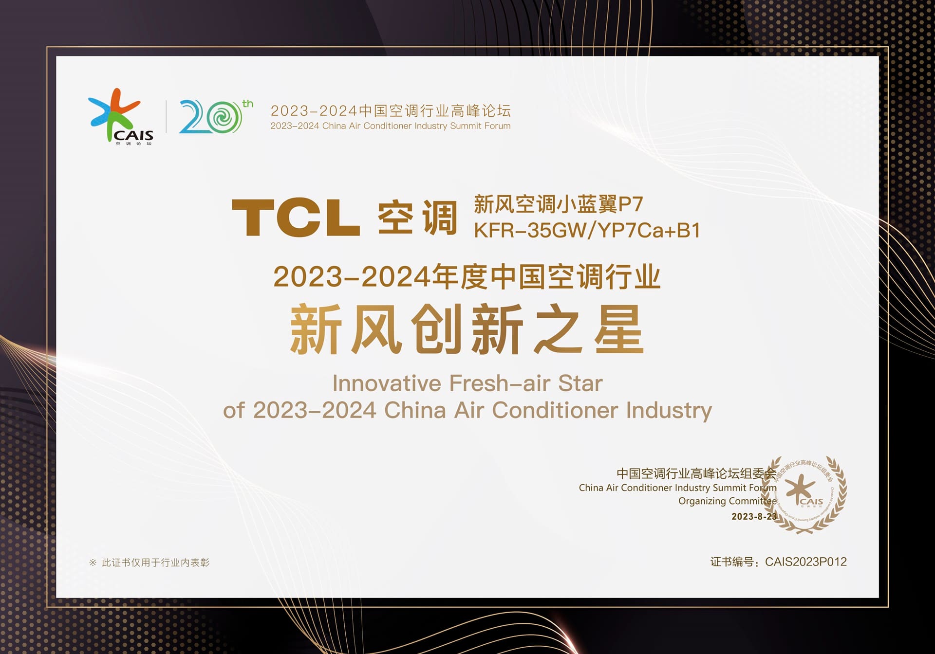 2023年7月,中国家用电器协会、中国家电网主办的2023-2024中国空调行业高峰论坛召开,TCL空调获颁新风领军品牌、TCL新风空调小蓝翼KFR-35GW/YP7Ca+B1获颁新风创新之星、TCL新风空调小蓝翼Ⅱ青春版Pro(KFR-35GW/YP1Cb+B1)获颁杰出渠道表现产品。