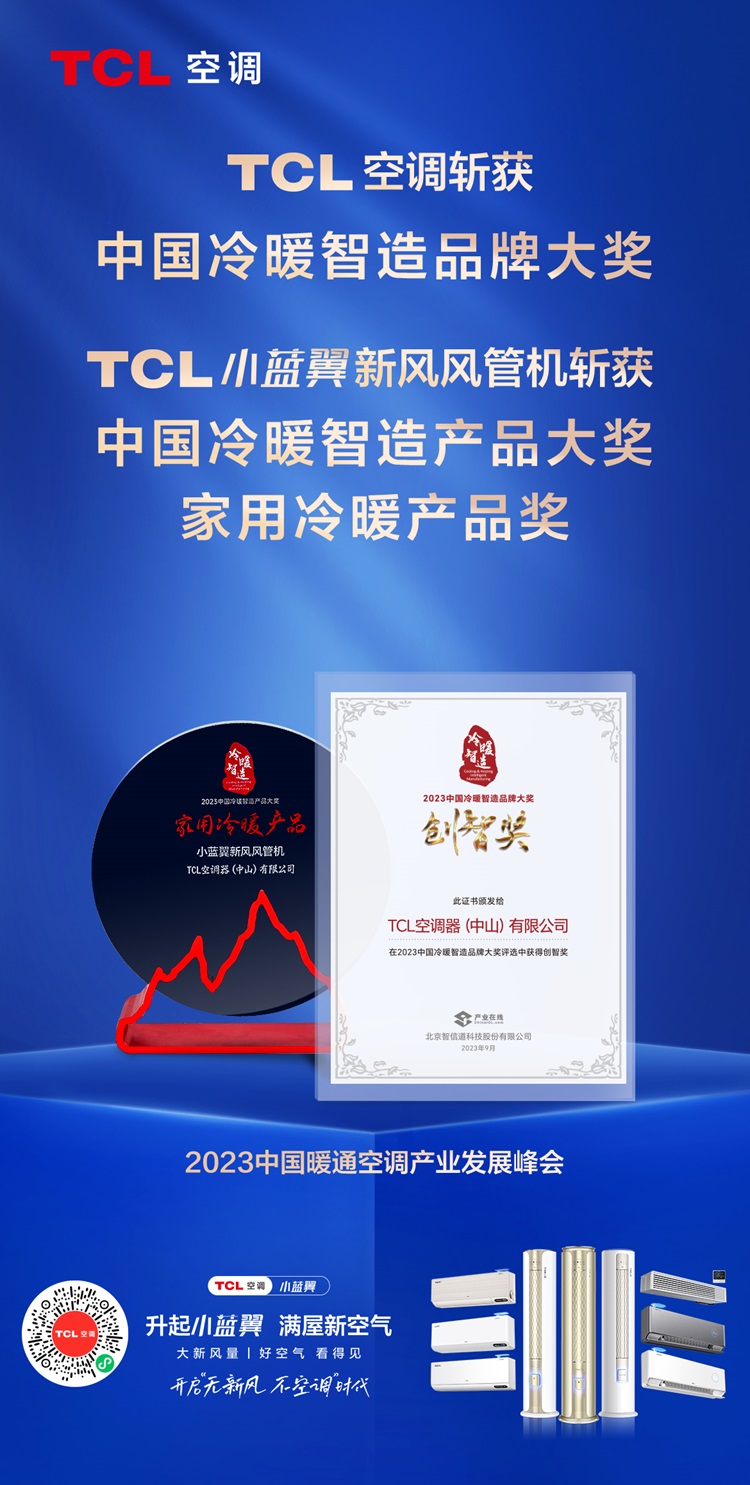 2023年9月14日-15日,TCL空调在2023 中国暖通空调产业发展峰会暨中国“冷暖智造”颁奖盛典上一举斩获2023中国冷暖智造品牌大奖创智奖,旗下家庭中央空调产品——TCL小蓝翼新风风管机,斩获2023中国冷暖智造产品大奖家用冷暖产品奖。