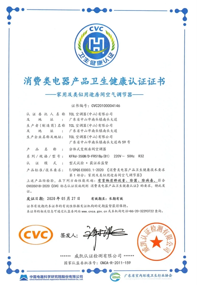 2020年6月 TCL空调荣获中国电器研究院、威凯检测中心联合颁发“消费类电器产品卫生健康认证”;成为首批卫生健康认证的消费类电器产品
