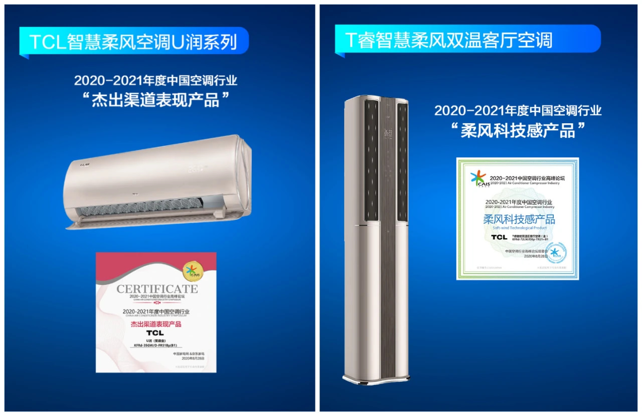 2020年8月,TCL空调一举揽下中国空调行业高峰论坛颁发的“智慧创新品牌奖”、“柔风科技感产品”、“杰出渠道表现产品”三项行业年度大奖。