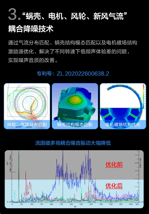 通过气流分布匹配、蜗壳结构模态匹配以及电机磁场结构激励源优化,解决了不同转速下低频声体验差的问题,实现噪音改善。