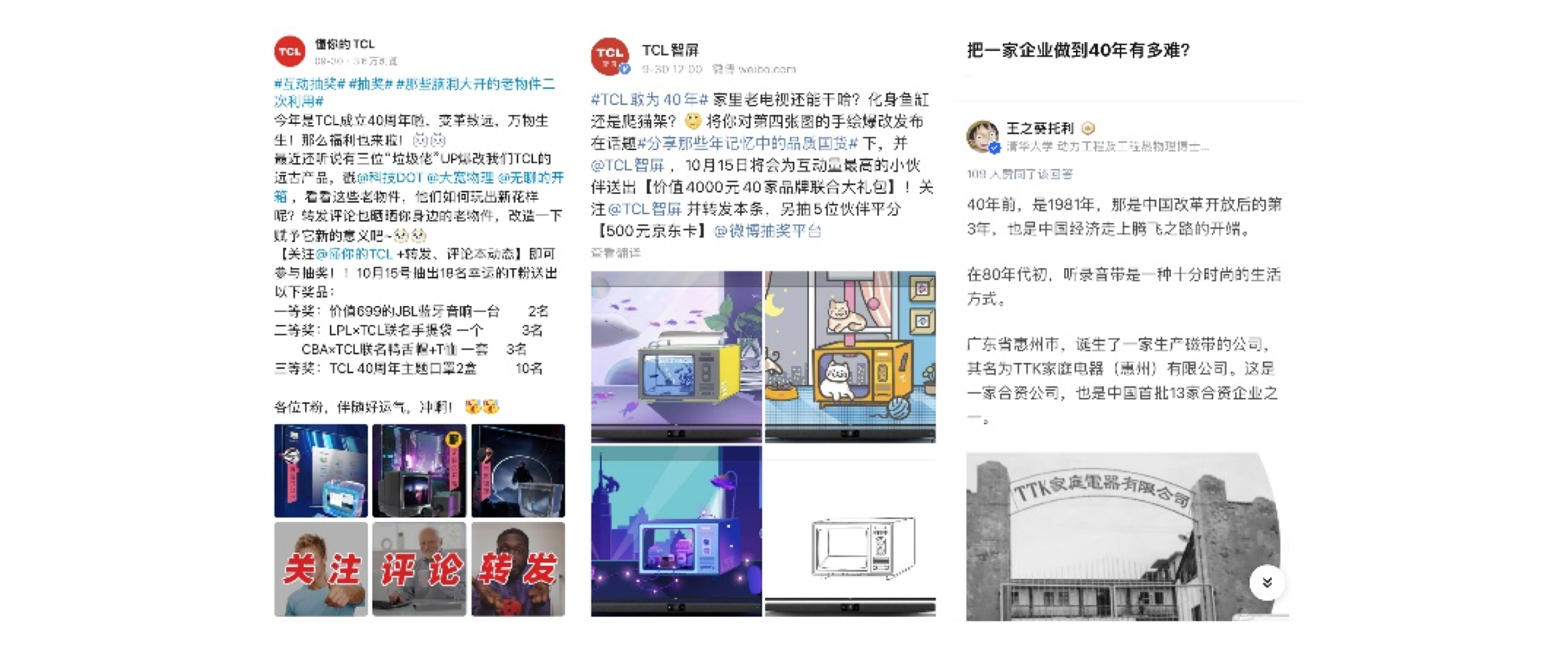 首先,TCL分别在微博、B站、知乎发布“舆论造势向、趣味娱乐向、口碑科普向”三大话题:#分享那些年记忆中的品质国货# #那些脑洞大开的老物件二次利用# # 把一家企业做到40年有多难?#,一边借势国潮引导用户发表国货品质讨论,勾起年轻圈层对国货的好奇心,另一边通过话题探讨加深传播浓度,以接地气的科普互动让用户感知到TCL品牌40年成长的荣耀与不易。