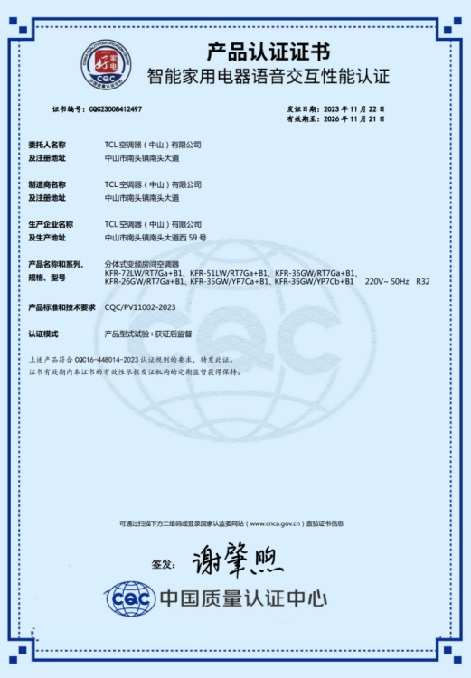 2023年11月24日,中国质量认证中心发布中国首批“好家电认证”,TCL空调斩获“智能家用电器语音交互”以及“空调器舒适性除湿”两大权威性能认证。