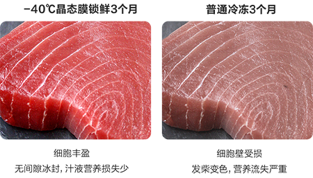 突破性地将冰箱冷冻温度降低至-40℃,-40℃细胞级冷冻,急速穿越冰晶带,在食材表面形成一道晶态锁鲜膜,锁住海鲜肉类本身水分营养,屏蔽外界细菌干扰,留住最初的新鲜原味。